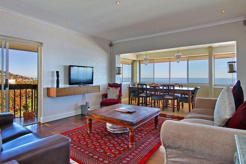 Large lounge and dining area with big elevated sea views over Sea Point below. Door opens onto the suspended wooden deck running along the length of the apartment.