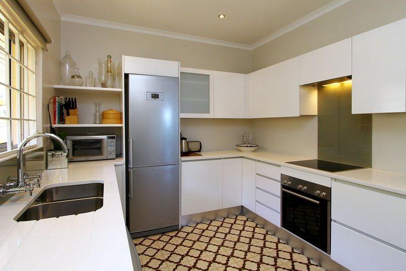 The kitchen is cool, bright and new. Whether food preparation to you is dispensing a bowl of cornflakes, nuking last nights pizza or making roullade of acorn fed black pig with mitake fritters, there are the implements and devices required.