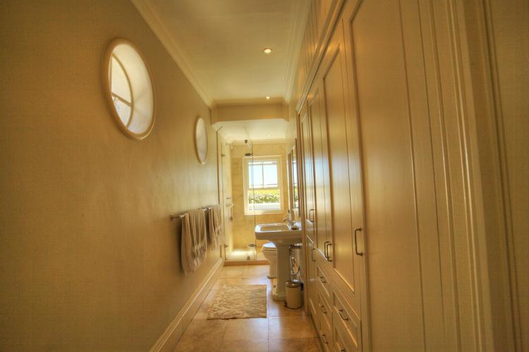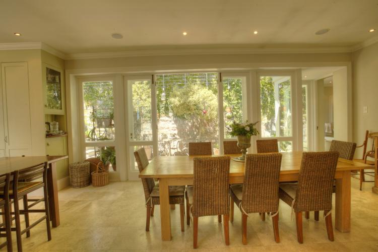 The open plan kitchen is French styled with an arch shaped breakfast nook, which is adjacent to the dining area that has an 8-seater table. It is also next to the formal lounge that has a cozy fireplace and beautiful comfy couches plus a TV room with a large flat screen, complete with full DStv and WiFi.