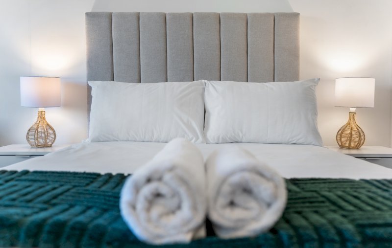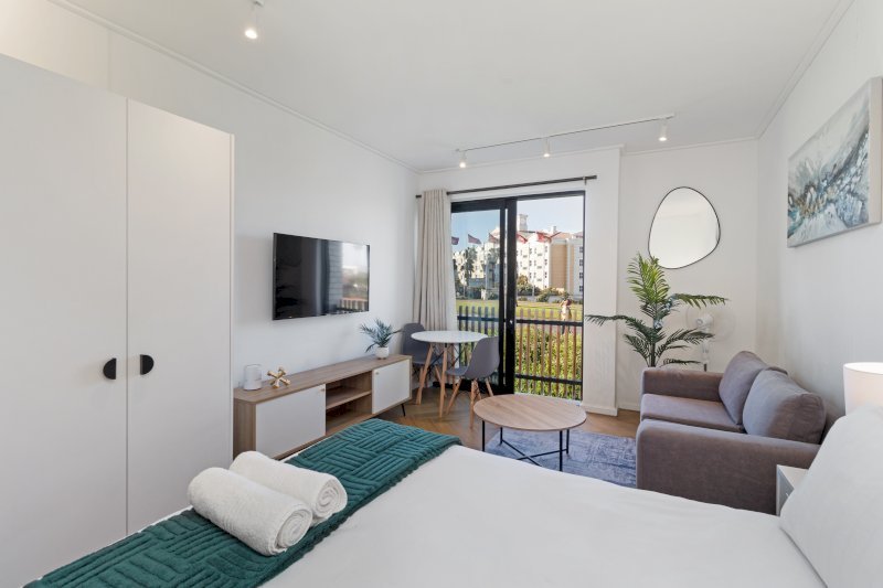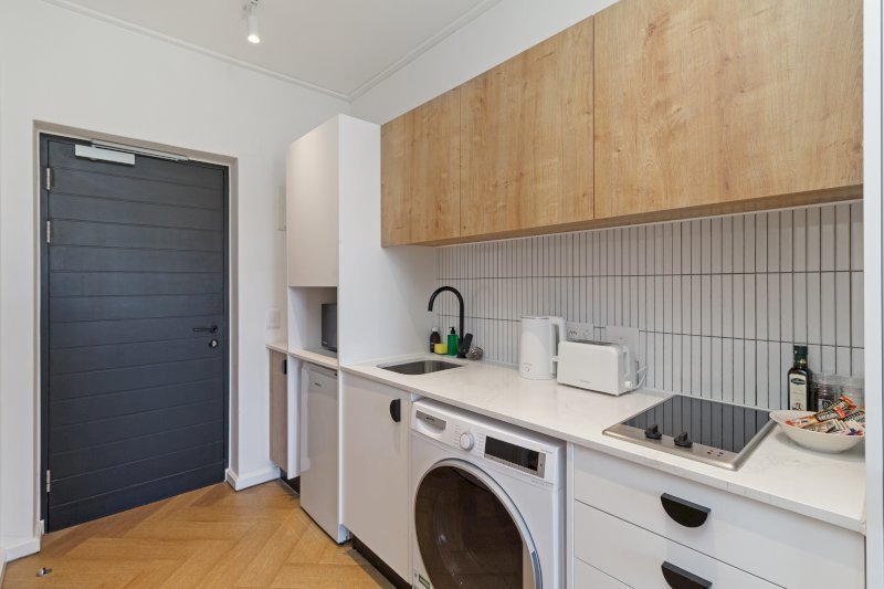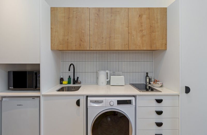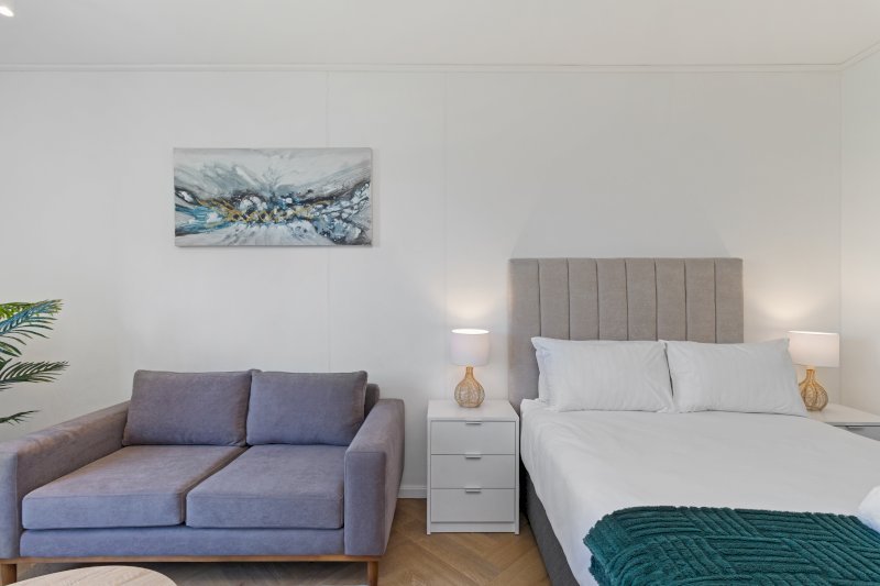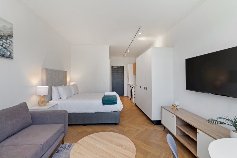 Contemporary and stylish, this thoughtfully designed studio is ideal for solo travelers, couples, or business guests. The open-plan layout includes a sleek, fully equipped kitchen that flows into the lounge area, leading to a comfortable sleeping space with a plush double bed.