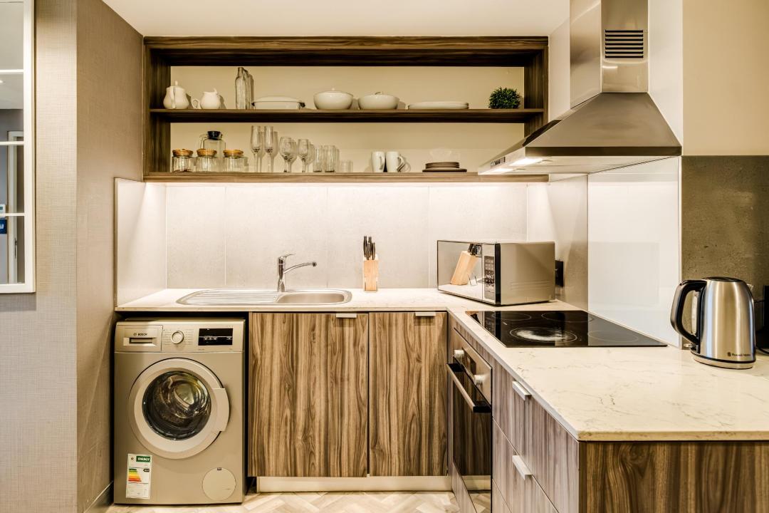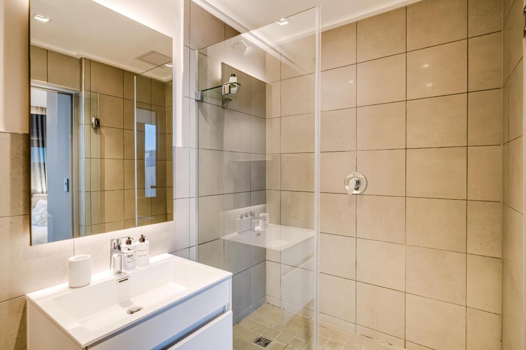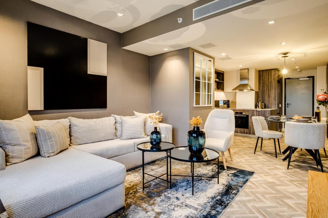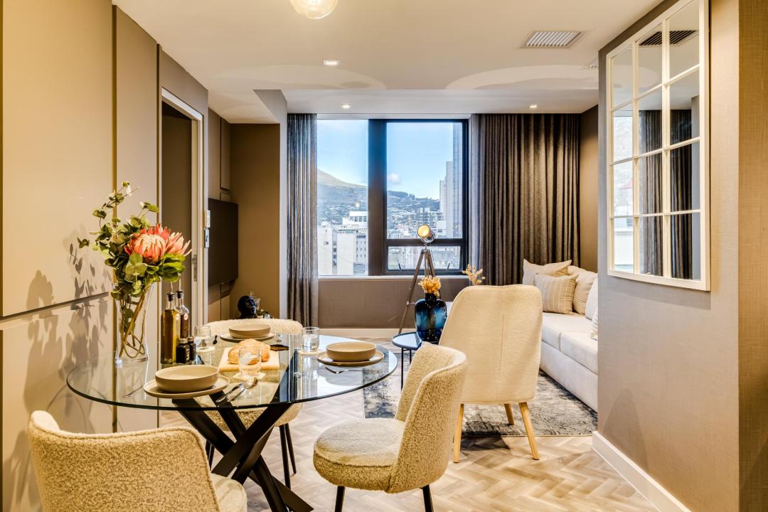 This bright and well-designed apartment offers a spacious living and dining area, a fully equipped kitchen, and a queen-size bedroom with ensuite, creating a practical and relaxing home base in Cape Town.