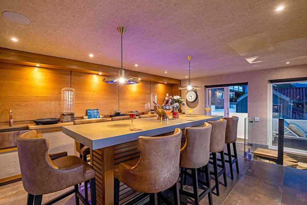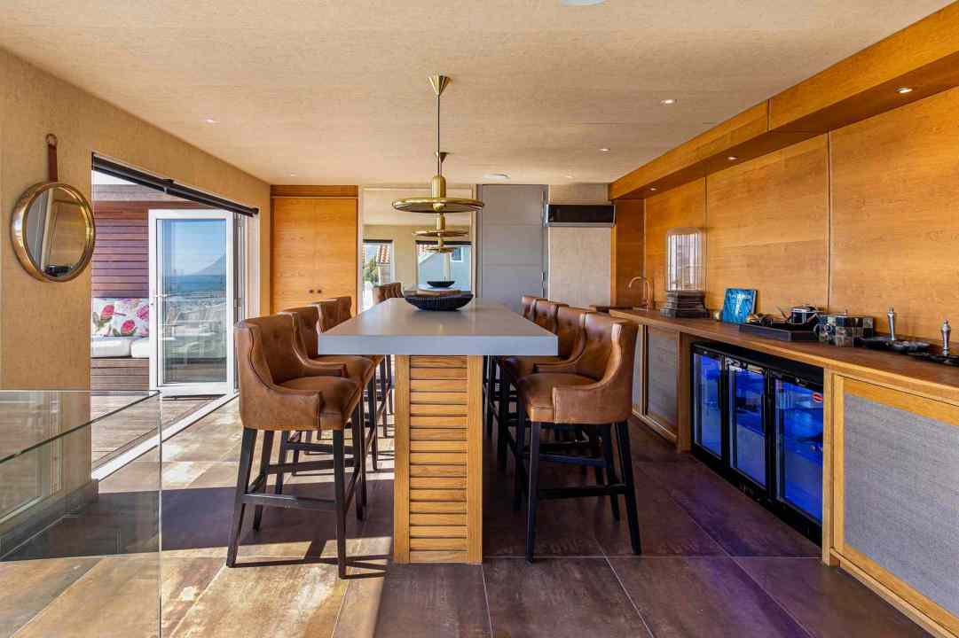 On ground level you will find a lovely living area that opens onto the garden and pool area. The open plan kitchen is also here. Up one more level and you will find two double bedrooms, and then on the third level there is a magnificent entertainment area, second bar and large terrace with wonderful views, and also faces the sunset.