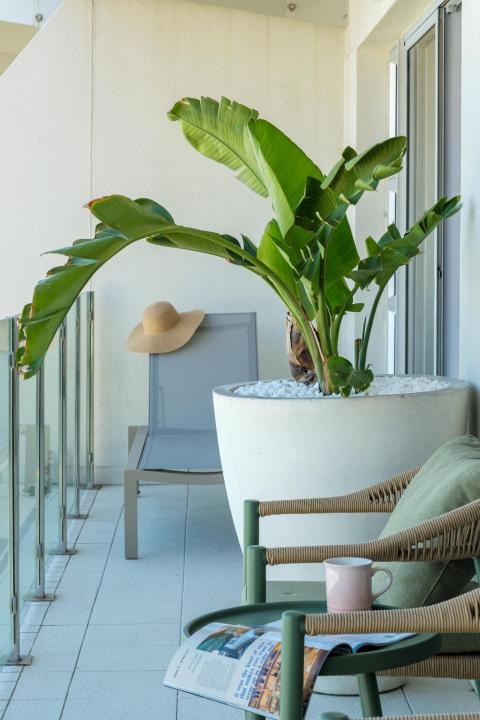 The private balcony is furnished with seating and a sun lounger, creating the perfect setting for morning coffee, afternoon relaxation, and unforgettable Atlantic sunsets.