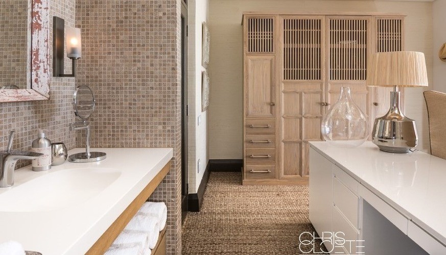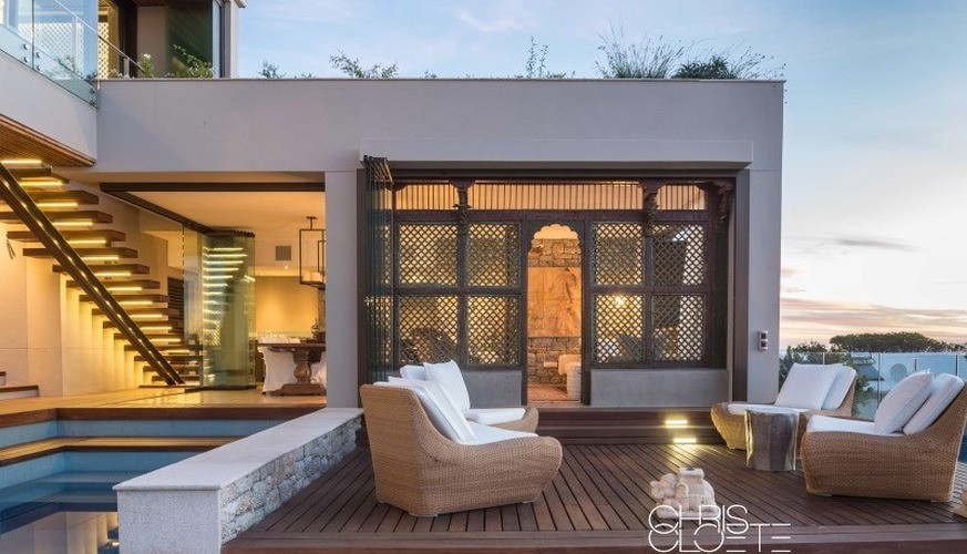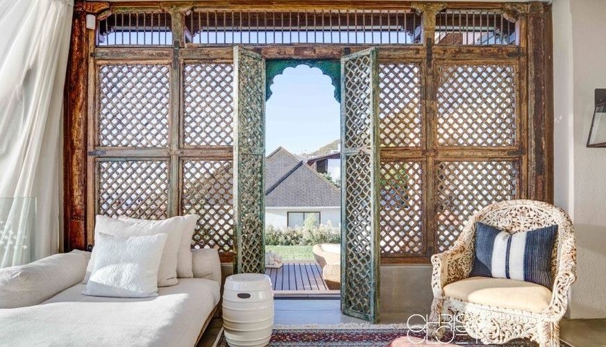 The décor is wonderfully eclectic, reflecting collections and memories gathered over years of travel to exotic destinations. Wooden doors reclaimed from a monastery are adorned with goat bells, Moroccan- or Indian-inspired woodwork and trellises are used to create privacy or to create a soft filtered light in the all-weather outdoor room, and a sense of the Orient pervades throughout. The scent of magnificent blooms cascading from crystal vases and the gentlest hint of incense greets one on entry as the late-afternoon sun glows and fills the main entertaining area and well-appointed kitchen with an embracing welcome. Deeper-than-deep couches are there to envelop and comfort, and dinners are either enjoyed at the generous dining table or out on the split-level deck. Everywhere, views of the mountain or sea are framed cleverly by thoughtful architectural details but the most popular chill area by far is the outdoor room or pool house – with its pizza oven for relaxed meals together, or the extra-depth chaises, positioned to take in glorious sunsets or ever-changing seascapes. Opening out to the garden and lap pool, it’s quite possible to spend hours lazing here with not a care in the world.