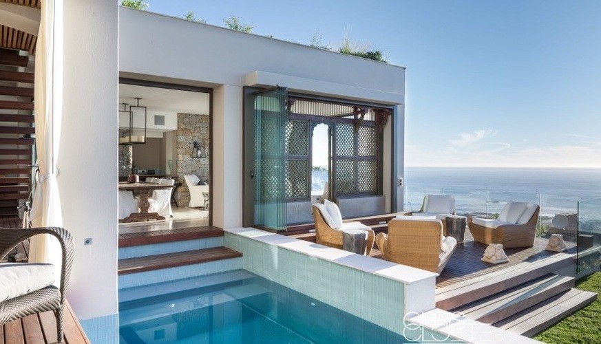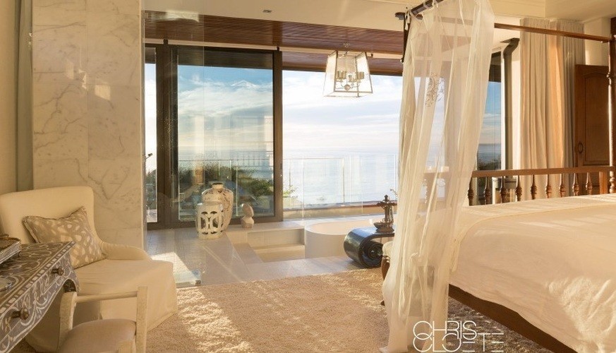 Upstairs, the master suite is a private enclave off the open-plan living area with an extensive dressing room behind. Bathing in the sunken bath in front of the four-poster bed is the ultimate luxury, with views to match. Come summer, the glass doors slide back for a view of the stars, and in winter, the fireplace next to the bath glows with warmth. Downstairs, three beautifully decorated en-suites each have views and one has a separate entrance leading into a peaceful courtyard garden planted with lush greenery. There are, in fact, three entrances to this home, potentially giving four couples absolute privacy at all times.