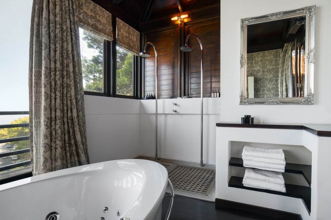- Bedroom 1 – Master: King size bed, Ensuite bathroom with stand-alone shower & bathtub, Television, Balcony, View of Sea.