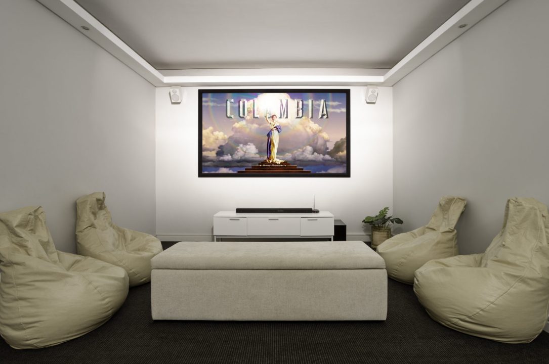 Cinema room with overhead projector, large screen, aircon / heater,