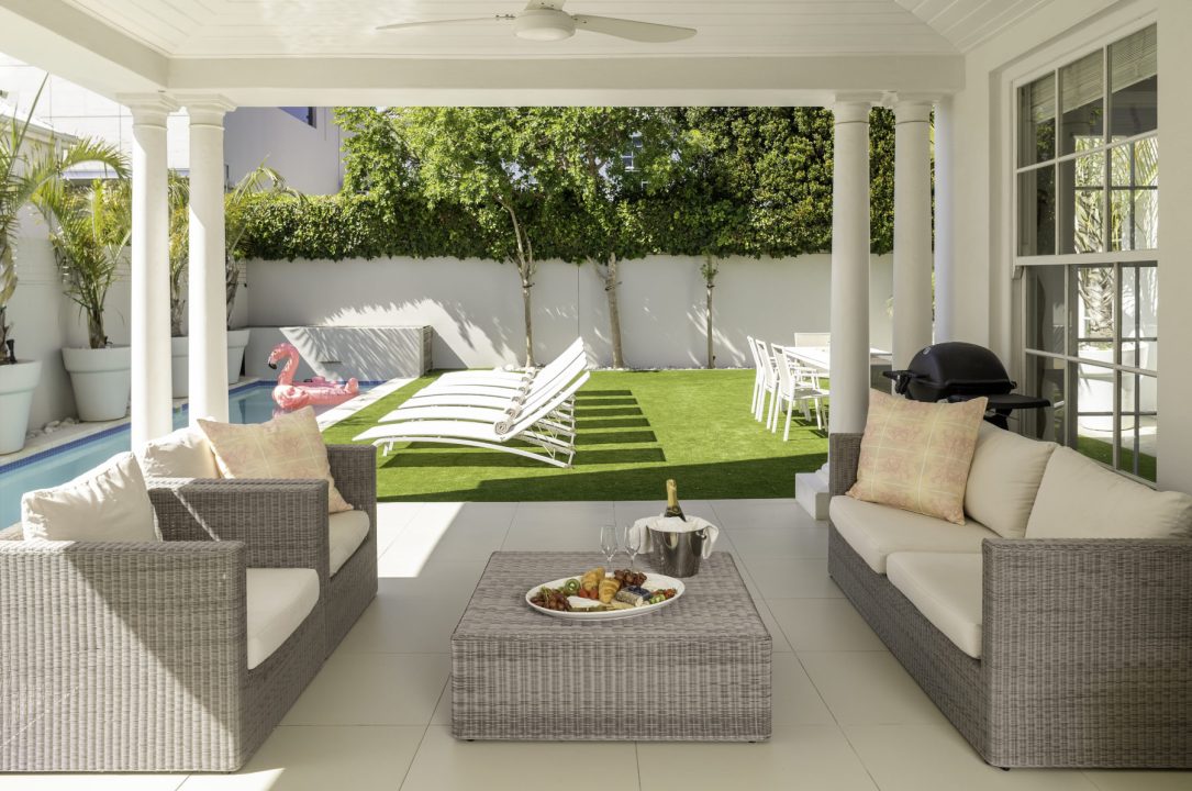 Patio with outdoor lounge seating leads to the 2,5 x 13m pool and 8-seater outdoor table, Weber BBQ and 6 sun loungers