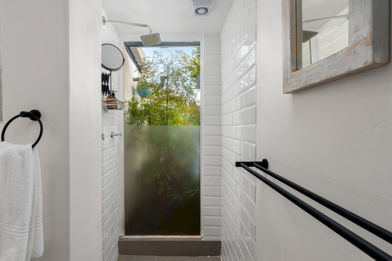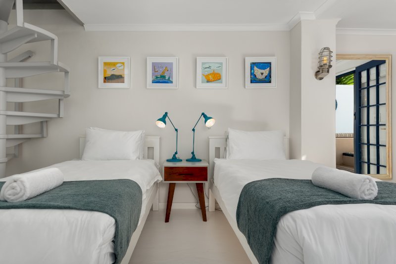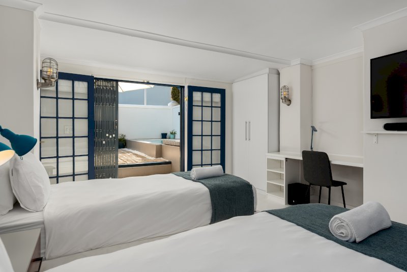 Downstairs, the second bedroom offers a queen-size bed with an open en-suite bathroom, where a walk-in glazed shower looks onto lush courtyard greenery. The third bedroom, fitted with two single beds, opens directly onto the front courtyard and pool area and includes a TV with DSTV — ideal for children or additional guests.