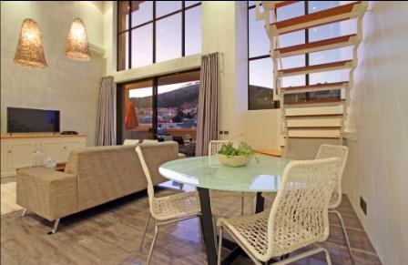 The lower level of the luxury apartment houses the main entertaining area. It is open-plan with the living and dining areas making full use of the views at the front of the apartment. Glass doors let in the breeze and when open, the flow from inside out is seamless. Slick lines, glass, chrome and dark wood create a cool yet chic tone ideal for a business person or couple sharing with an eye for contemporary design and attention to detail.The lounge area has two elegant 4-seater couches and 2 chrome sling back chairs in which to relax in while watching your favorite movie on the plasma TV (with full entertainment system).
