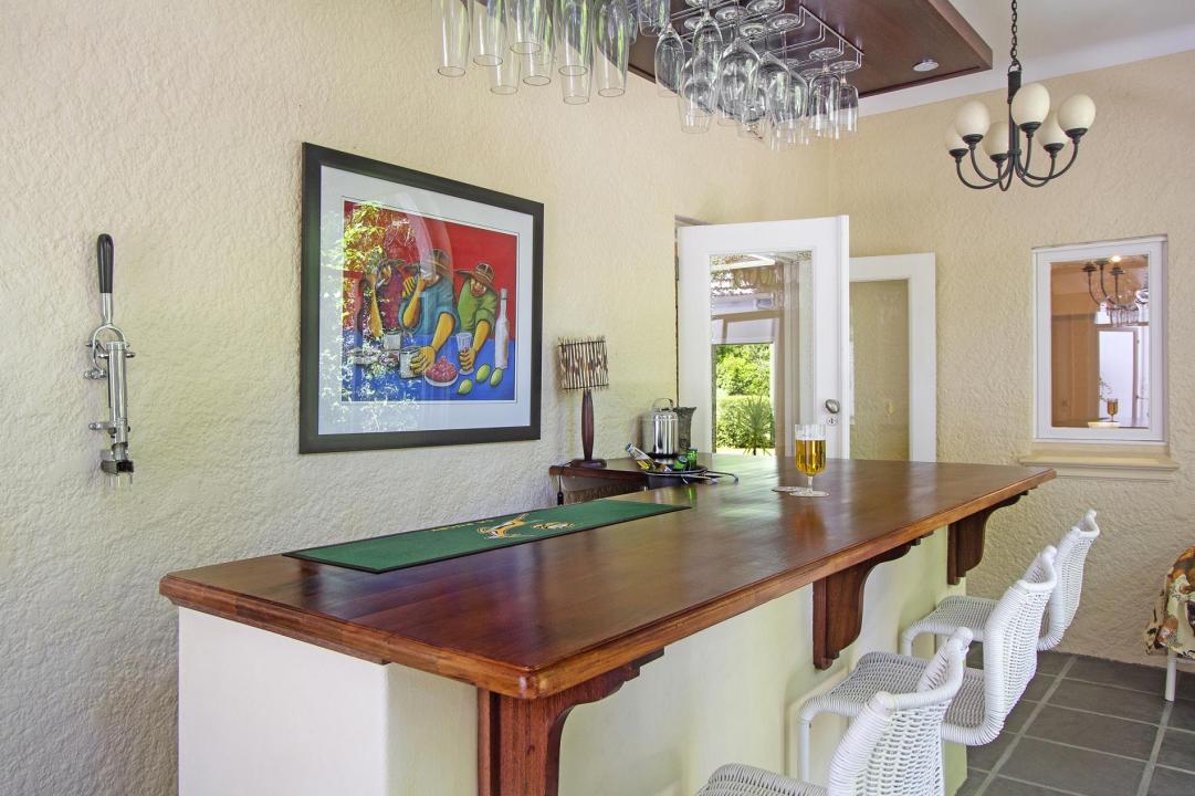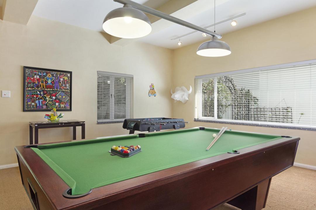 Just off the kitchen is a casual family room with comfortable couches and chairs and large sliding doors that open onto a patio and the garden and swimming pool area. A spacious television room has comfy couches, an entertainment system, and sliding doors that open onto the garden. There is also a games room with a pool table and table football with double doors onto a patio and a cosy bar area.