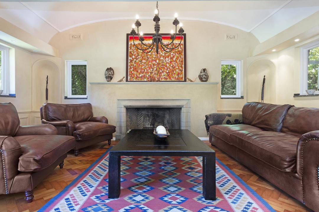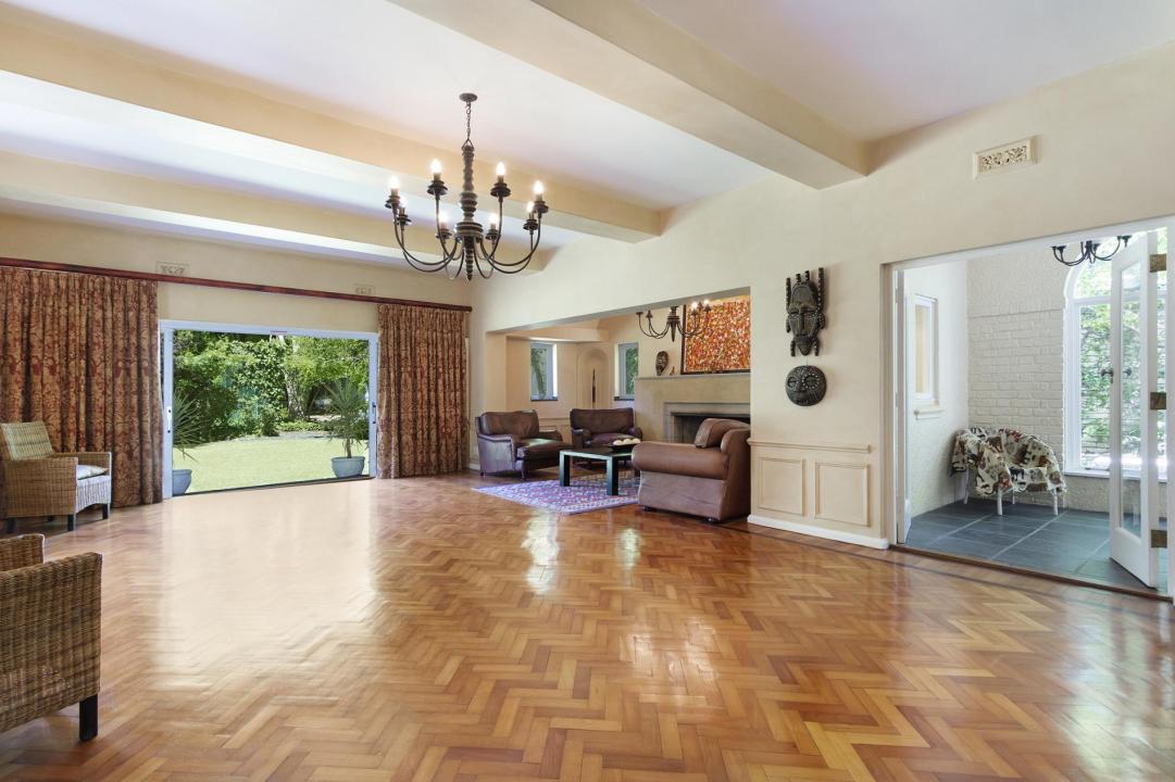 The entrance hall has stunning parquet flooring and a cosy sitting area with plush leather couches and a large fireplace. A formal dining room has a 10-seater dining table and chairs, a large fireplace, and lovely views of the garden through a large bay window.