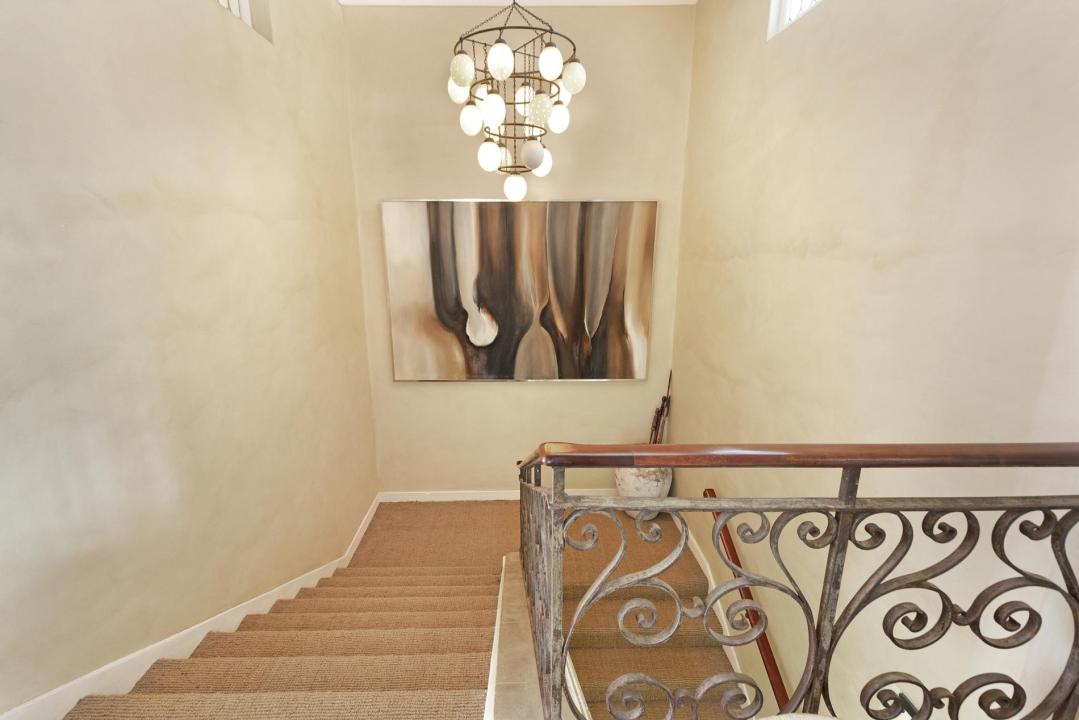 Upstairs there are five elegantly furnished bedrooms with carpeted floors and en-suite or shared bathrooms and lovely garden or mountain views. The master bedroom has a king-size bed and a spacious en-suite bathroom with a large shower, a freestanding bath, and underfloor heating. The second bedroom has a queen-size bed and an en-suite bathroom with a shower, while the remaining three bedrooms have twin beds and a shared bathroom with a shower.
