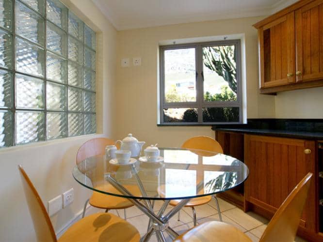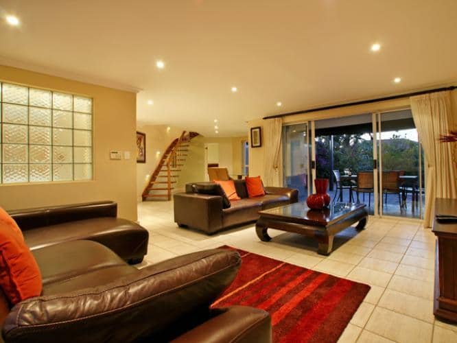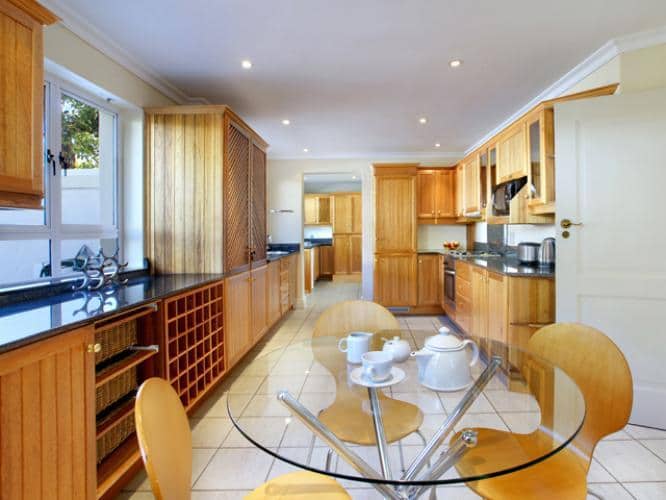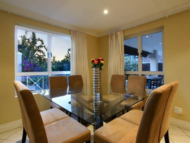 This holiday home has beige floor tiles with an earthy finish that is clean and welcoming. The spacious living room with its soft pastel walls and African-inspired artworks conveys a sense of comfort and ease around the chocolate-coloured leather lounge suite, glass-topped coffee table and antique-style furnishings, making it an ideal space to enjoy a DVD or watch satellite TV. Formal dining is a pleasure in the open plan dining room, around a lovely dining table with eight comfortable suede-covered dining chairs and air-conditioning to create a contented atmosphere on warm summer evenings.