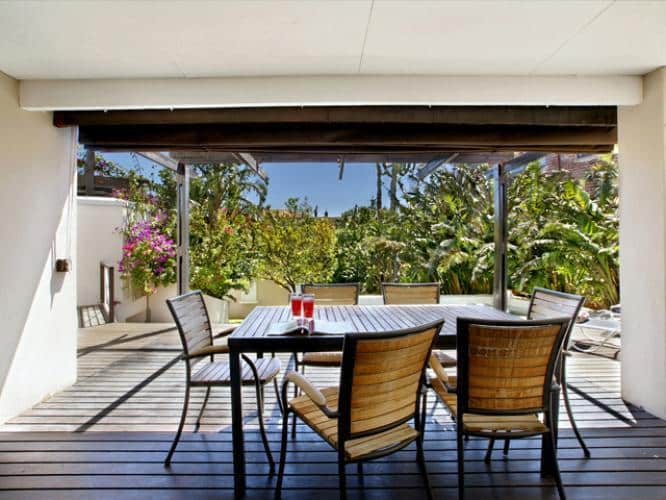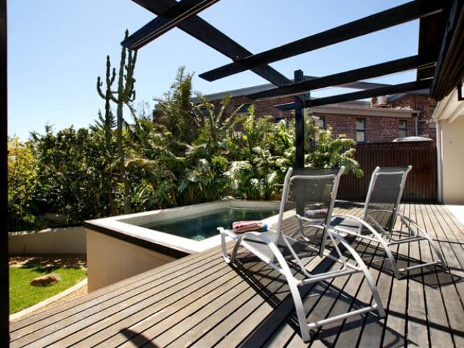 Sliding glass doors open up to the wooden outside deck and allow for easy indoor-outdoor entertaining. It is an ideal setting to enjoy a cocktail or some exceptional Cape wine. Effortless relaxation is easily achieved on sun loungers around the sparkling turquoise pool and the garden offers a green, leafy haven that is perfect for escaping into a good book. A generous built-in barbecue ensures that outdoor entertaining on summer evenings is a delight.