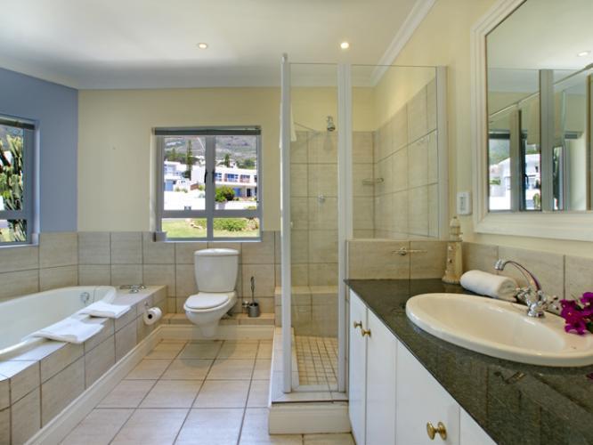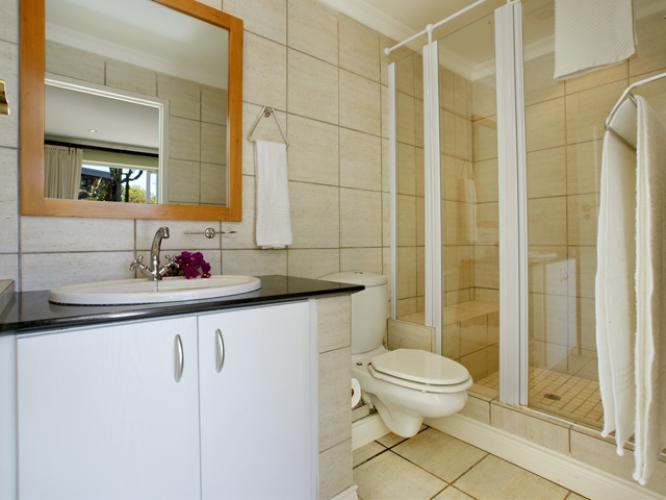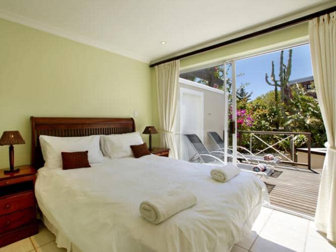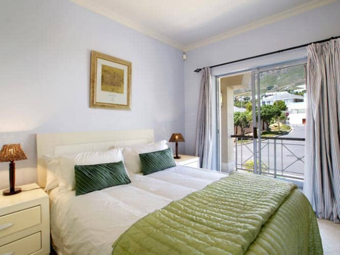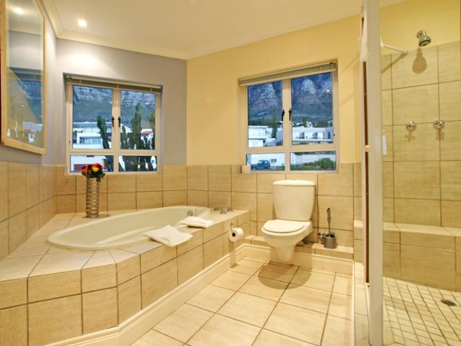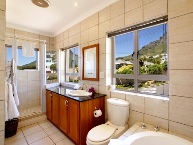 The second upstairs bedroom is a calming space with its soft blue walls and double bed. There is a generous bathroom with a large tub, shower, basin and toilet, as well as a breathtaking view of Table Mountain. The downstairs bedroom has modern recessed lighting and soft, cool green walls with a double bed and attractive dark wood furnishings. The en suite offers a generous shower, toilet and wash basin.