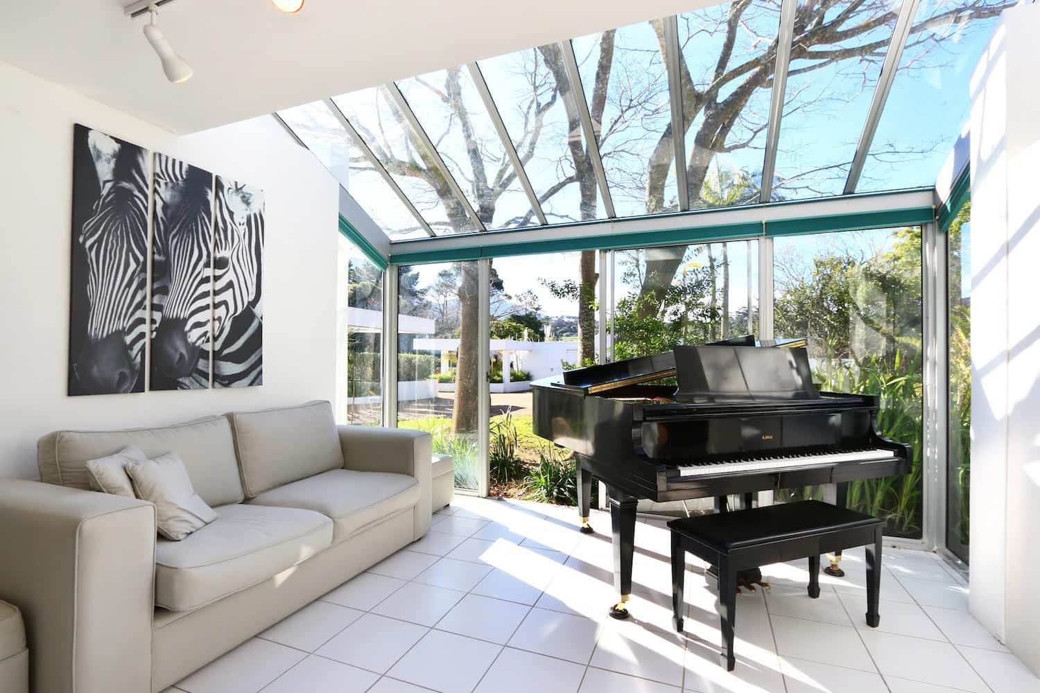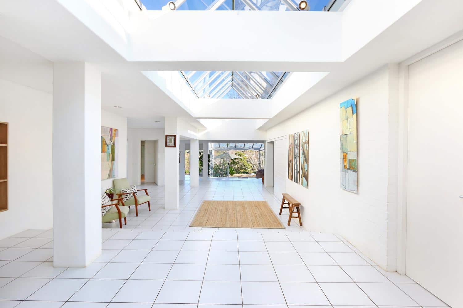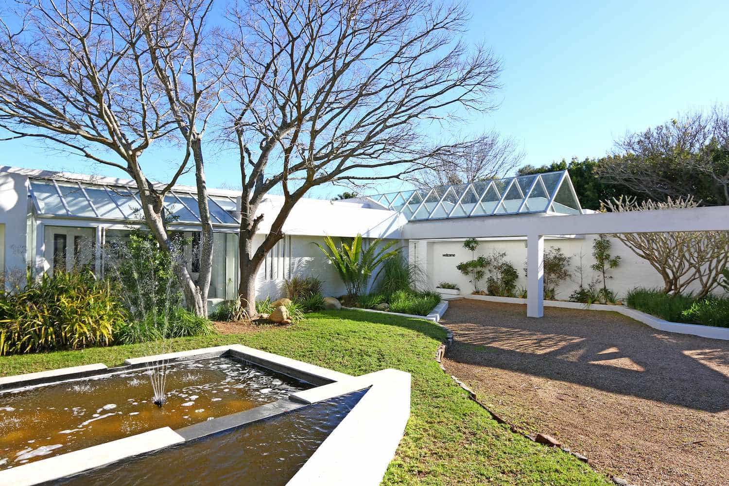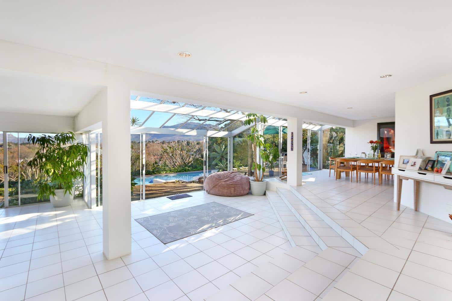 The glass-roofed entrance area leads to the open-plan lounge and dining room on either side. Big glass doors open out onto the swimming pool and more outside dining spaces.
