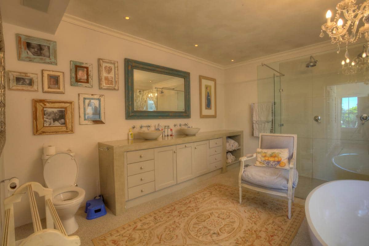 There is a total of 4 bedrooms- 1 bedroom upstairs with en suite shower and bath and 3 bedrooms downstairs. The master bedroom downstairs has an en suite shower and bath. There is an additional third bathroom with shower and bath. The downstairs bathrooms have heated towel rails and under floor heating. The upstairs bedroom and master bedroom, the open plan kitchen and lounge have air conditioning units. The house features a modern kitchen – microwave, 2 ovens (one incorporates a built in pizza oven, gas and electric hobs, fridge freezer and built in under counter bar fridge and dishwasher).