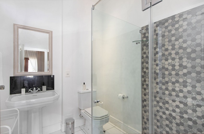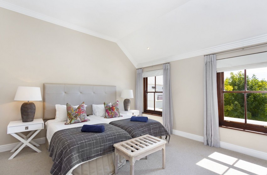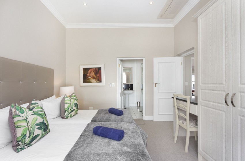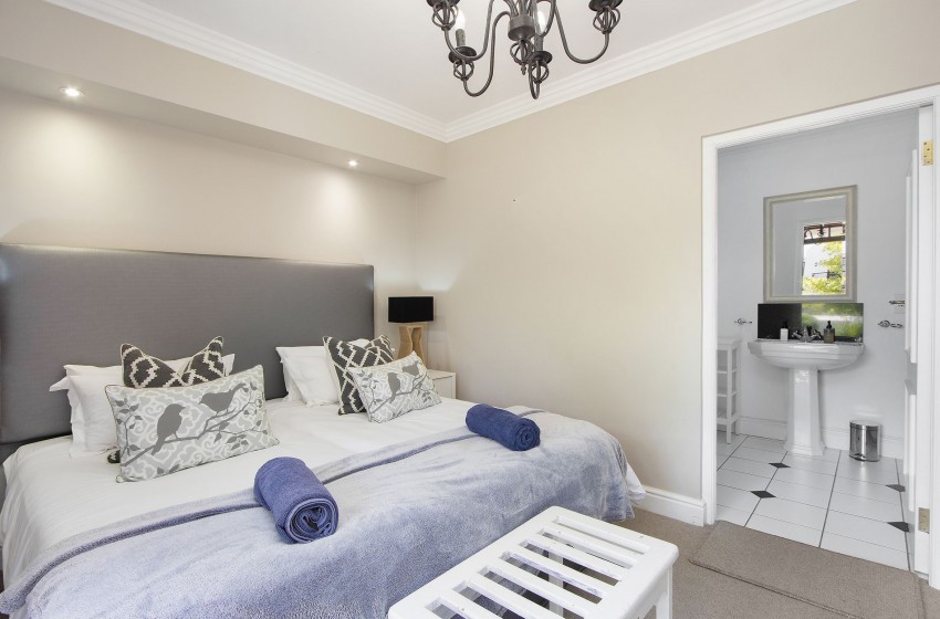 All 3 of the stylish bedrooms comprise of two single beds pushed together, with rooms 1 and 2, housing a shower and bath en-suite with the third room housing an en-suite with a shower. There is a lovely patio area with built-in braai facilities on the premises, overlooking the communal pool area; providing the perfect solution to an evening braai in a gorgeous outdoor setting. All guests have access to the communal pool area, which boasts a large swimming pool and a separate toddler pool.