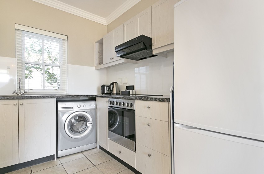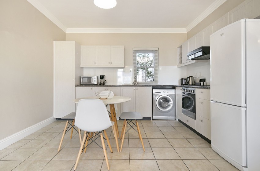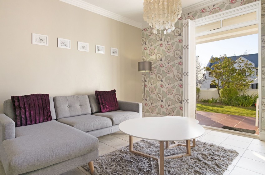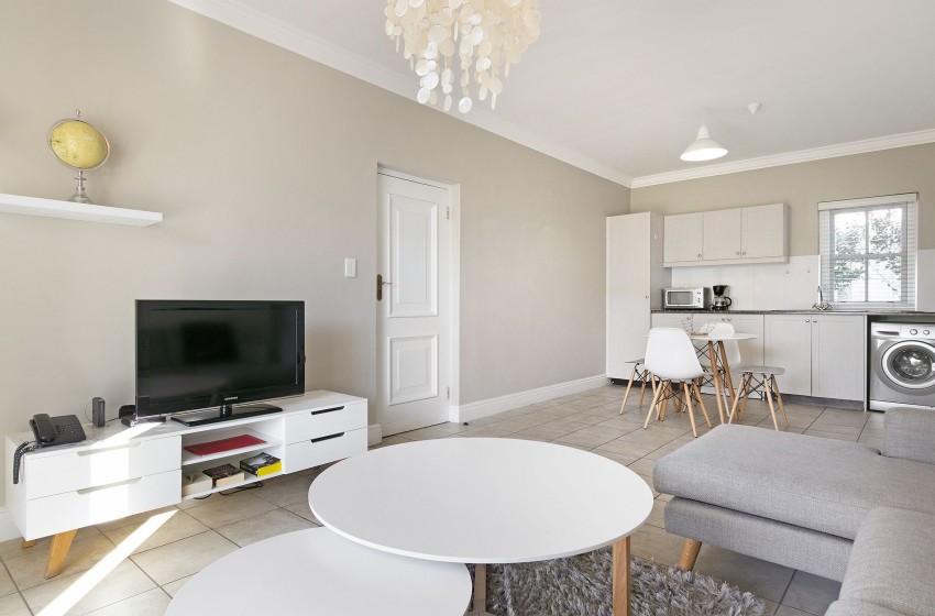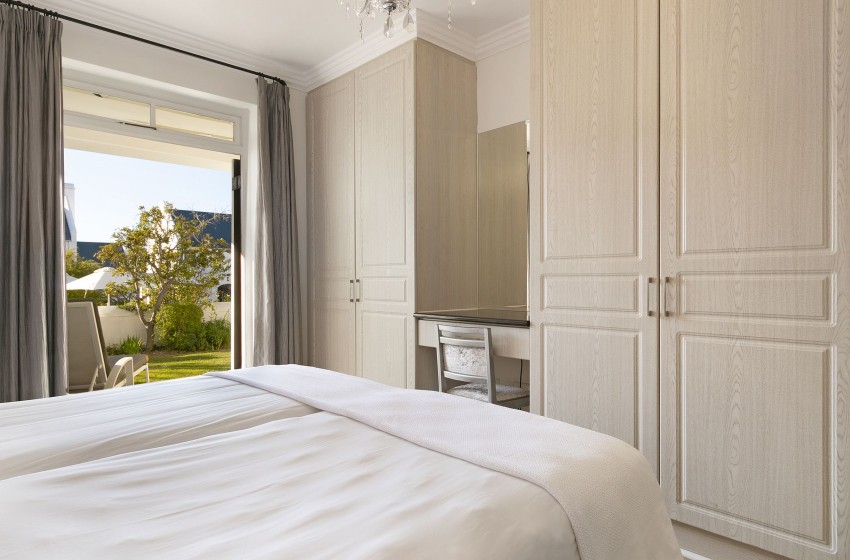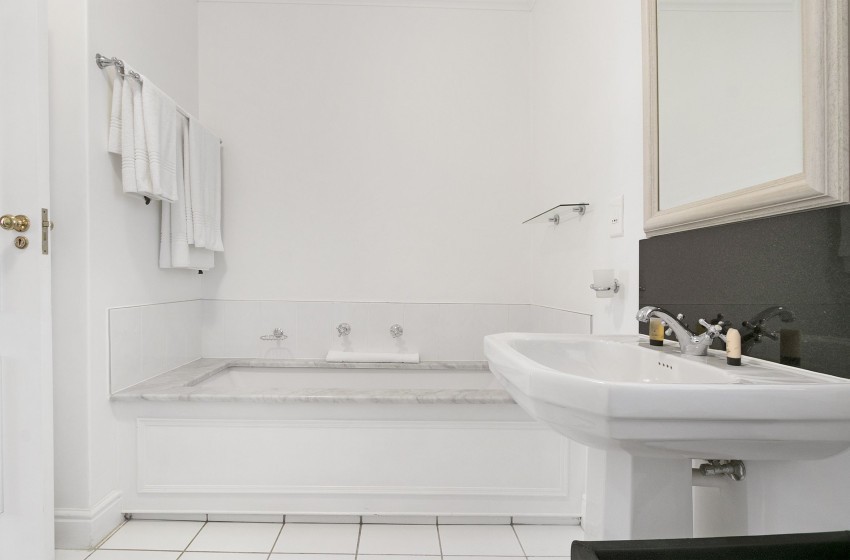 The bedroom retains the neutral style of the home while employing a splash of pink to breathe some magic into the apartment. The bedroom houses two single beds, which can be converted into a much more accommodating double bed. The room leads out onto a veranda overlooking the front lawn. The en-suite bathroom provides you with an immaculately crafted washroom, with a bathtub, shower and single basin.