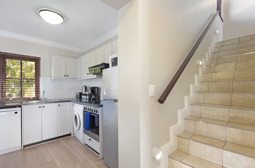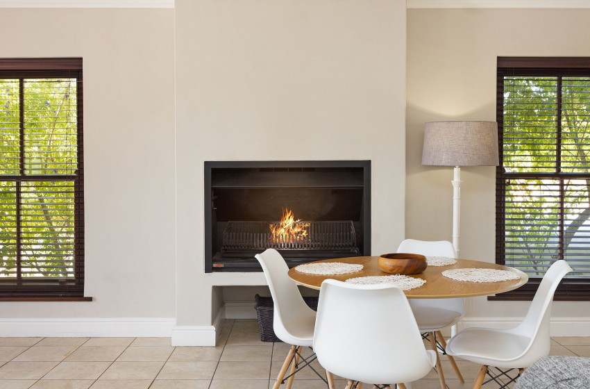 Everything required for a comfortable self-catering stay is fully supplied in the kitchen area. The toaster, kettle, and coffee machine ensure that the mornings get off to a good start. The house has a spacious, contemporary living/lounge area with a magnificent fireplace, ideal for those chilly winter nights, that opens onto a delightful patio with outdoor chairs where one can enjoy the stunning views of the mountains. You may maximize those late nights spent indoors with a Smart TV that has DSTV and WiFi features.