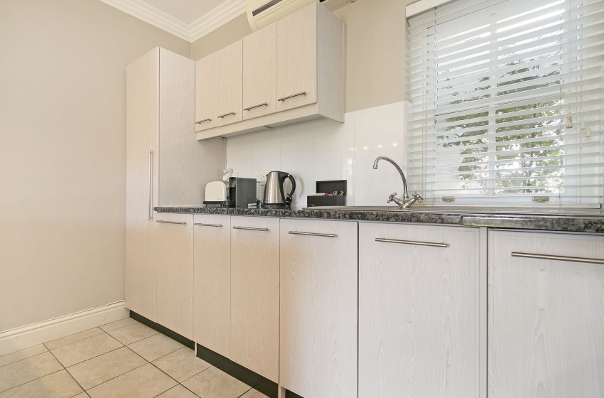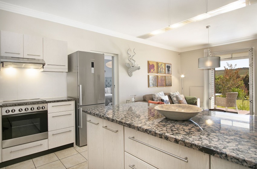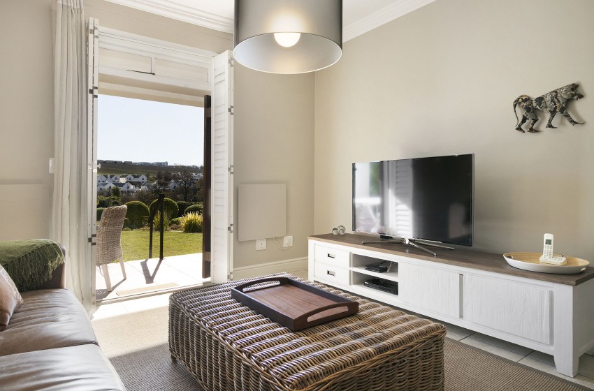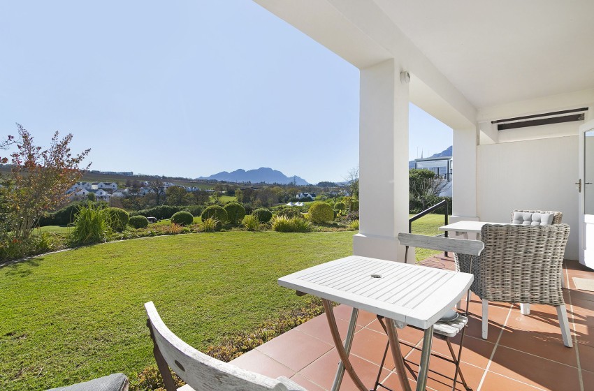 This one-bedroom apartment with great views, including a view overlooking the 10th tee of the golf course, and it offers a comfortable environment to its visitors, with an open-plan living room and kitchen that opens onto a big patio. The kitchen has a seating area that may accommodate two people and is fully equipped for your self-catering needs, including a Nespresso machine and wine fridge. The living room contains a TV with DSTV and WIFI, so you can enjoy a pleasant night at home with your loved ones. In the bedroom, a double-sized bed can be created from two single beds and there is also access to a private en suite bathroom. As soon as you wake up, the shutter doors open to a little garden where you may enjoy beautiful views of nature.