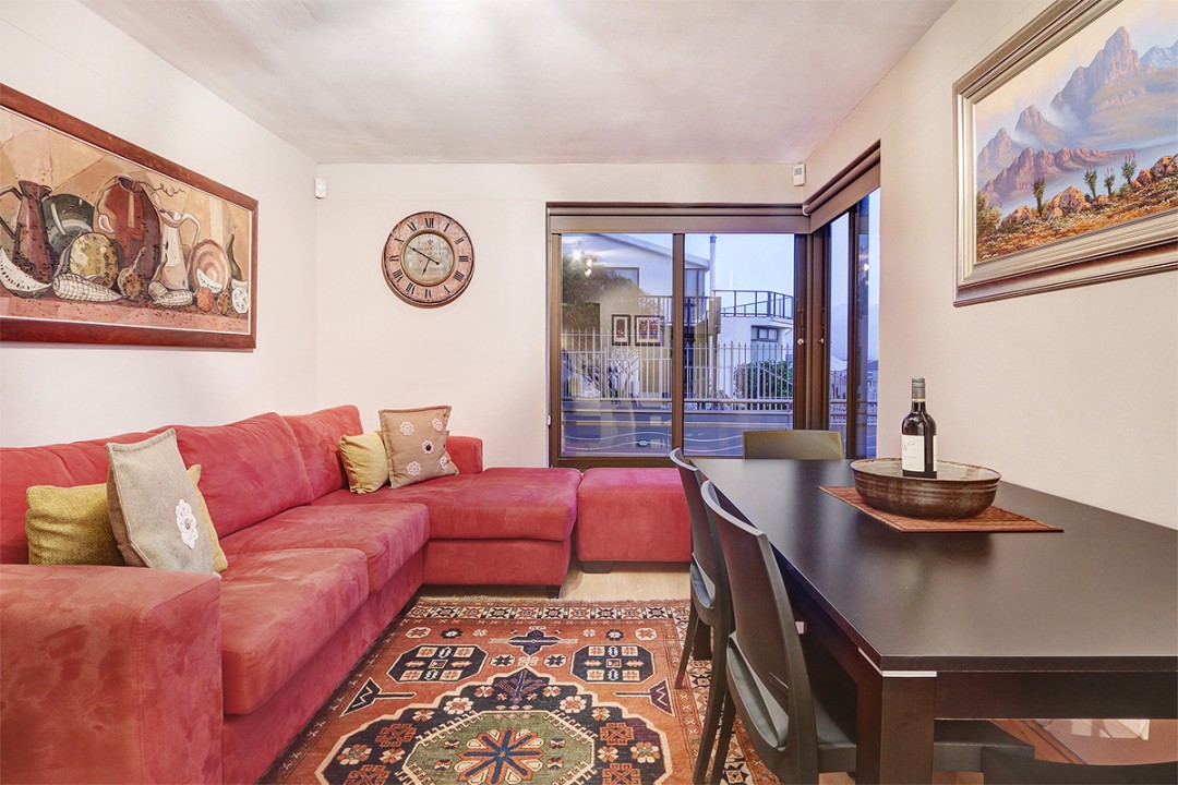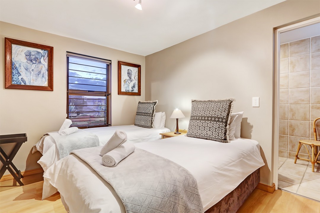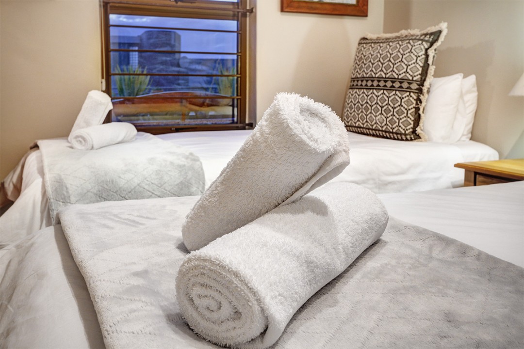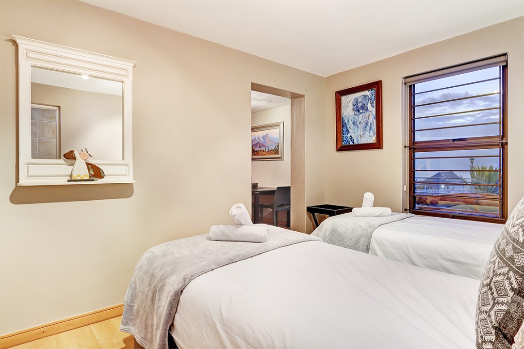 The second bedroom is furnished with two comfortable single beds, while this apartment also boasts a cosy living and dining room. Outside, guests can enjoy a BBQ or sundowners and take in the fresh ocean air.