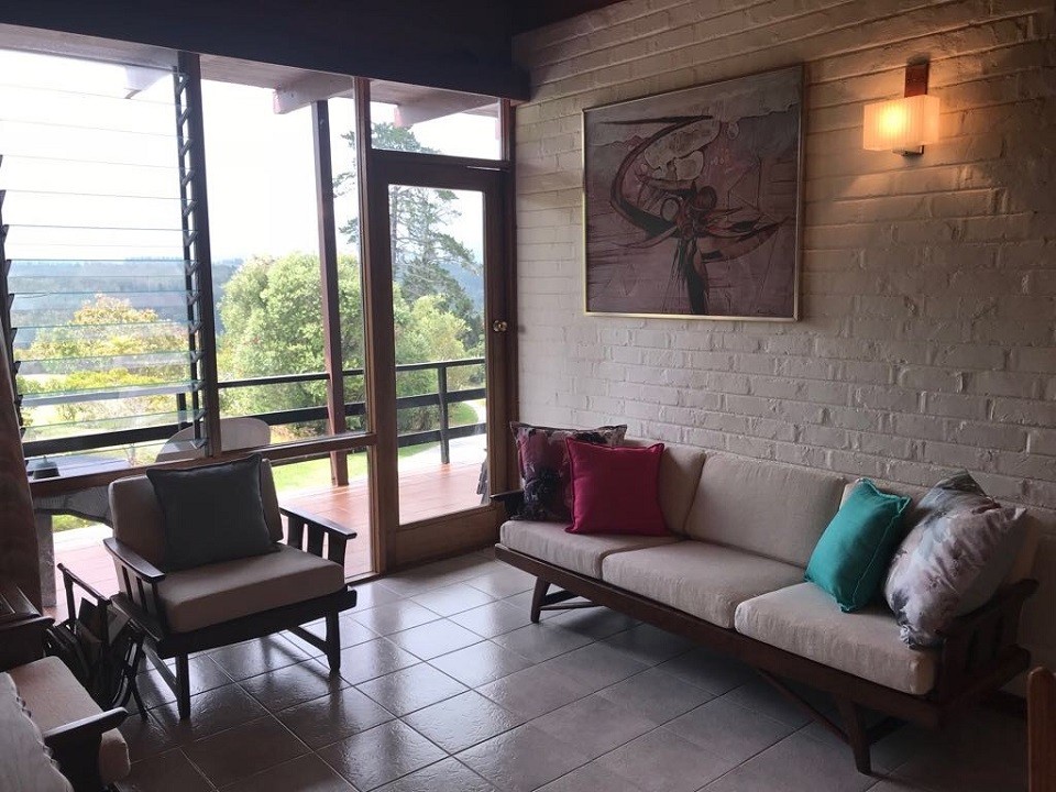 Living Area – Double size sleeper couch. Additional comfortable couches, writing desk. Opens onto shared balcony. Garden & mountain views.