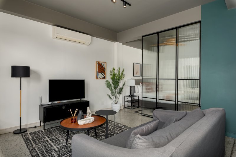 Natural light enhances the living space, while the fully equipped kitchen integrates seamlessly with the lounge area, creating an easy flow for everyday living. The bedroom provides a calm and private retreat, completing a residence that is both practical and refined.