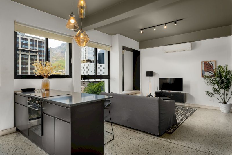 Positioned high above the vibrant streets of the CBD, this apartment captures sweeping views across the city towards Table Mountain. The interior is modern and streamlined, with an open-plan layout designed to balance comfort and functionality.