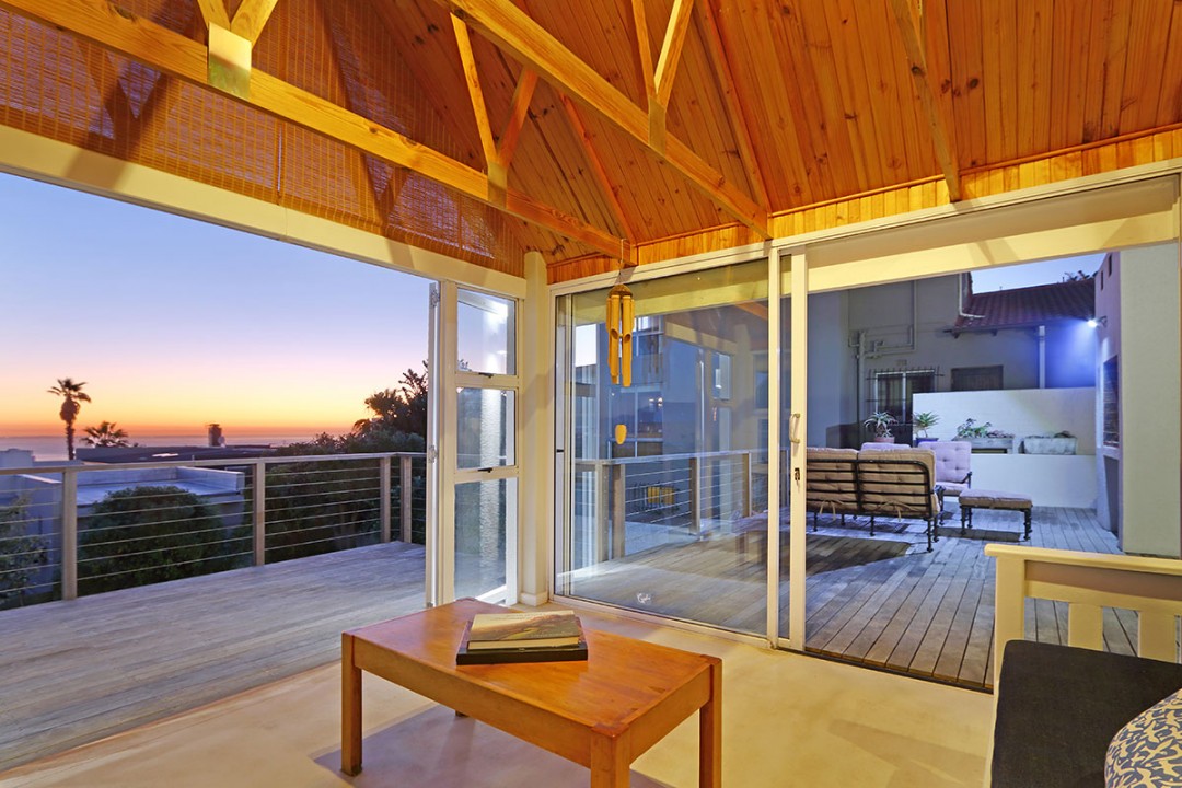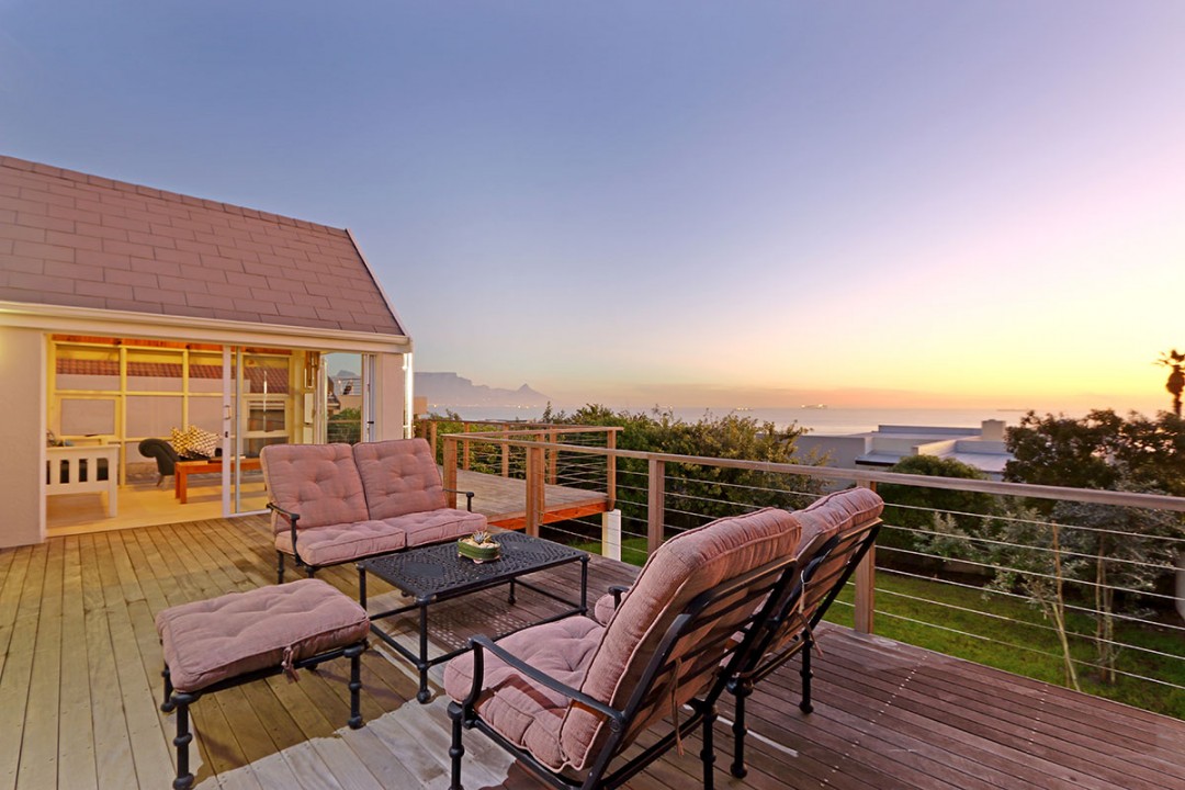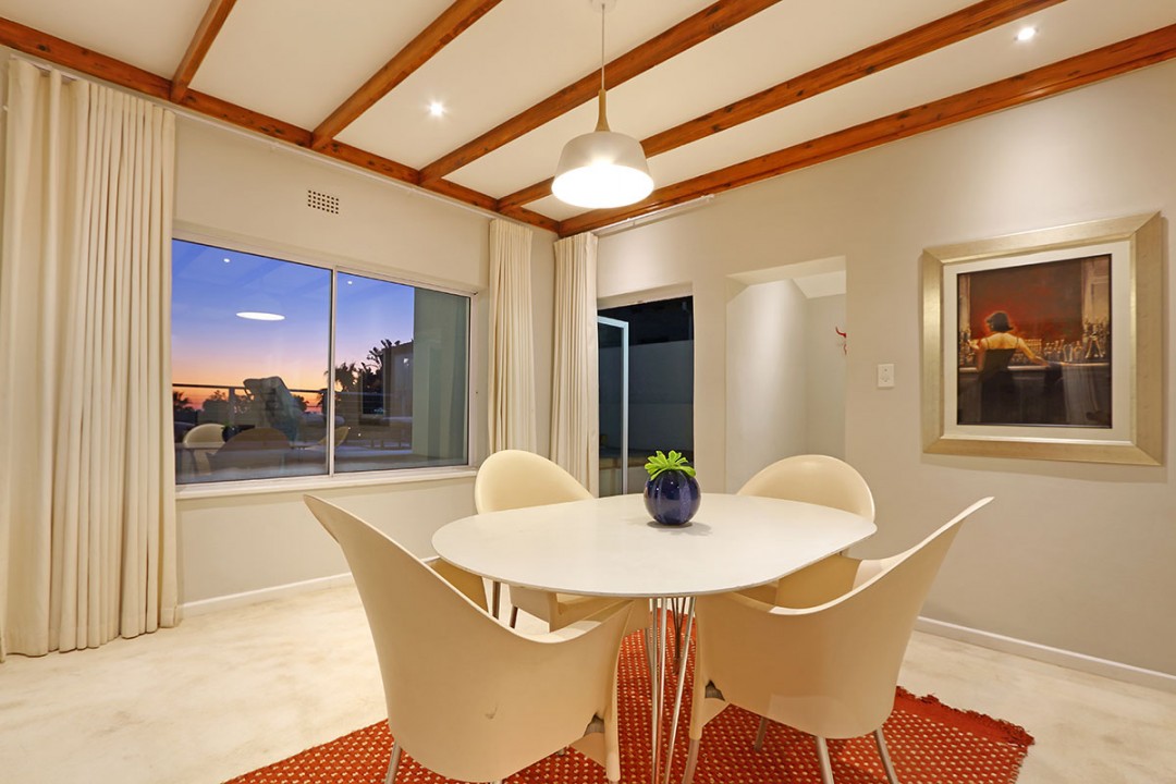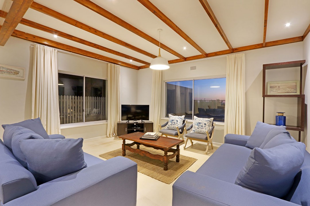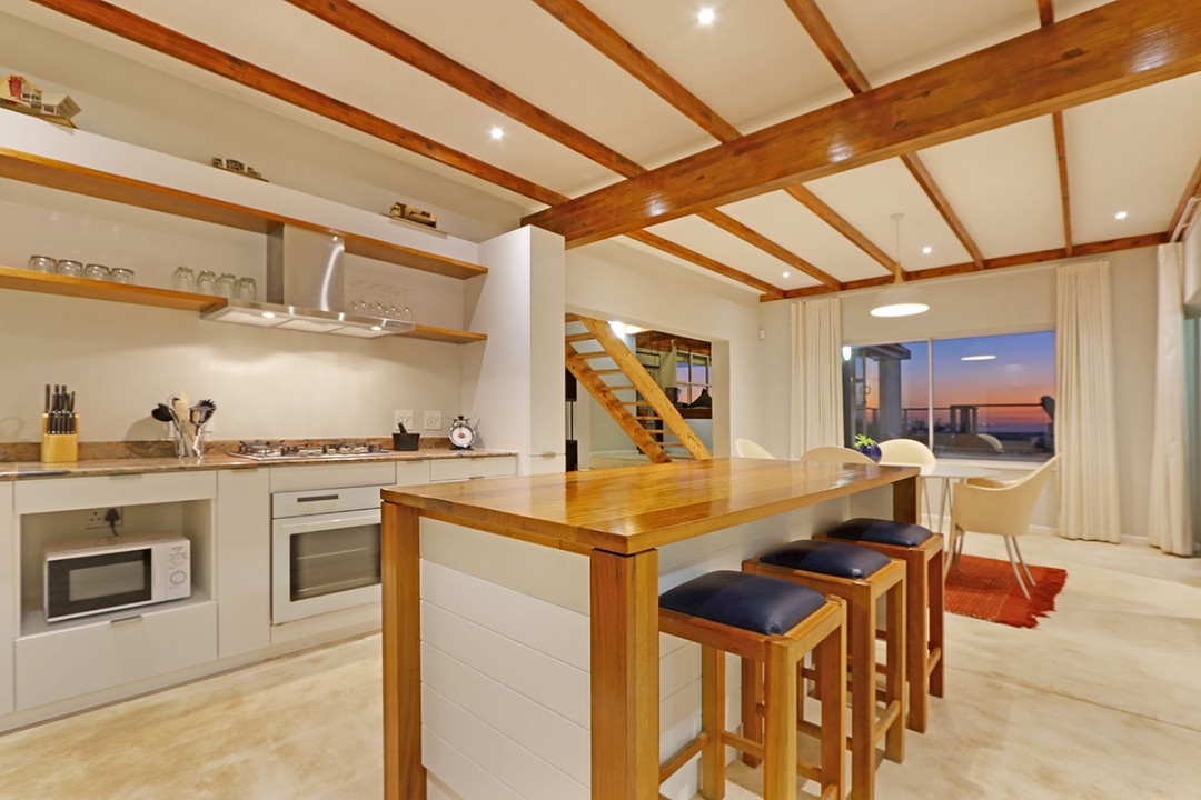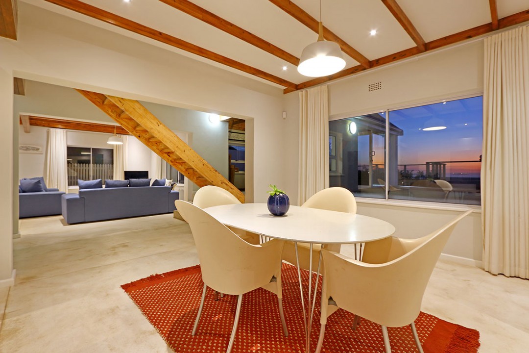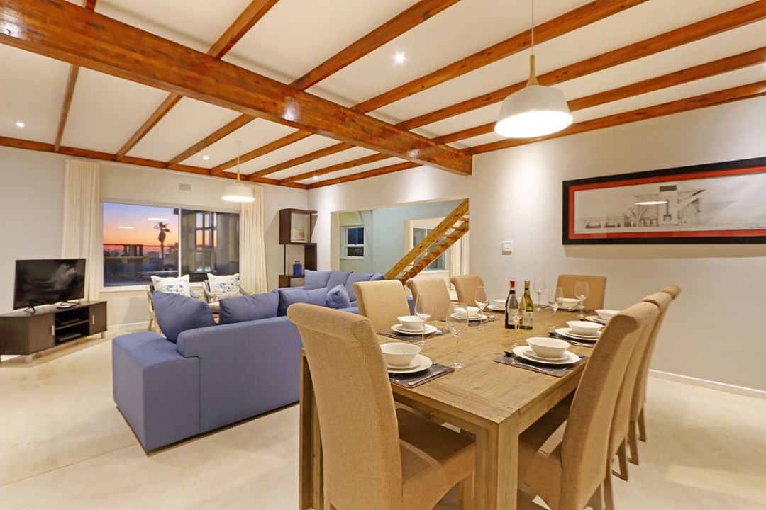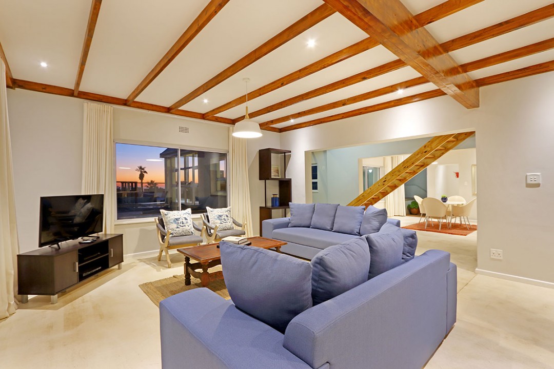 The lounge has 2 large couches and 2 single-seating chairs, arranged around a flat-screen TV with a DStv bouquet. The nearby dining area has seating for 8. This floor leads to an additional sitting area, which leads out to an extensive balcony with lounge furniture, a barbecue area as well as breathtaking views over the roofs of neighbouring houses towards the ocean.