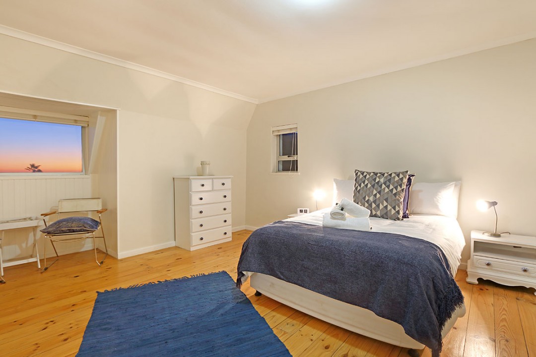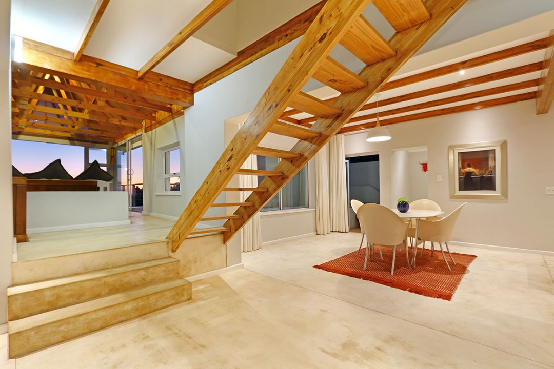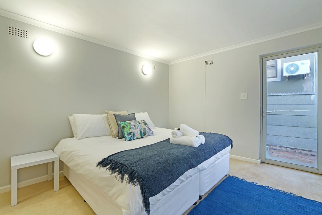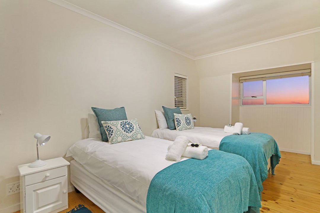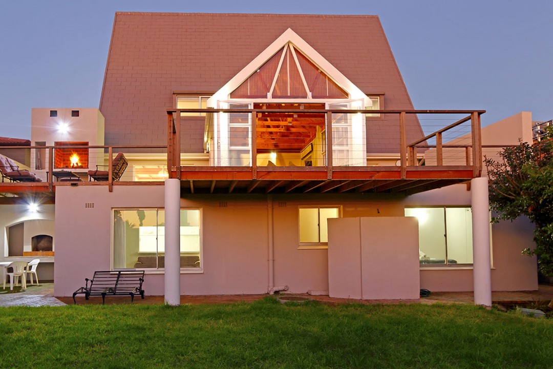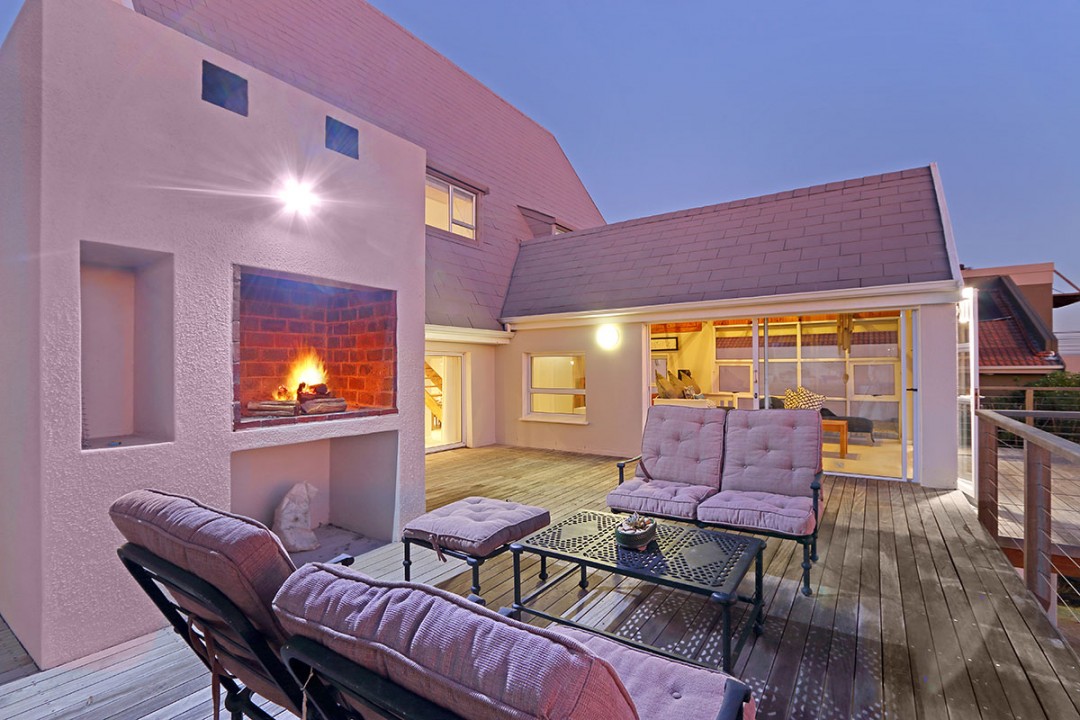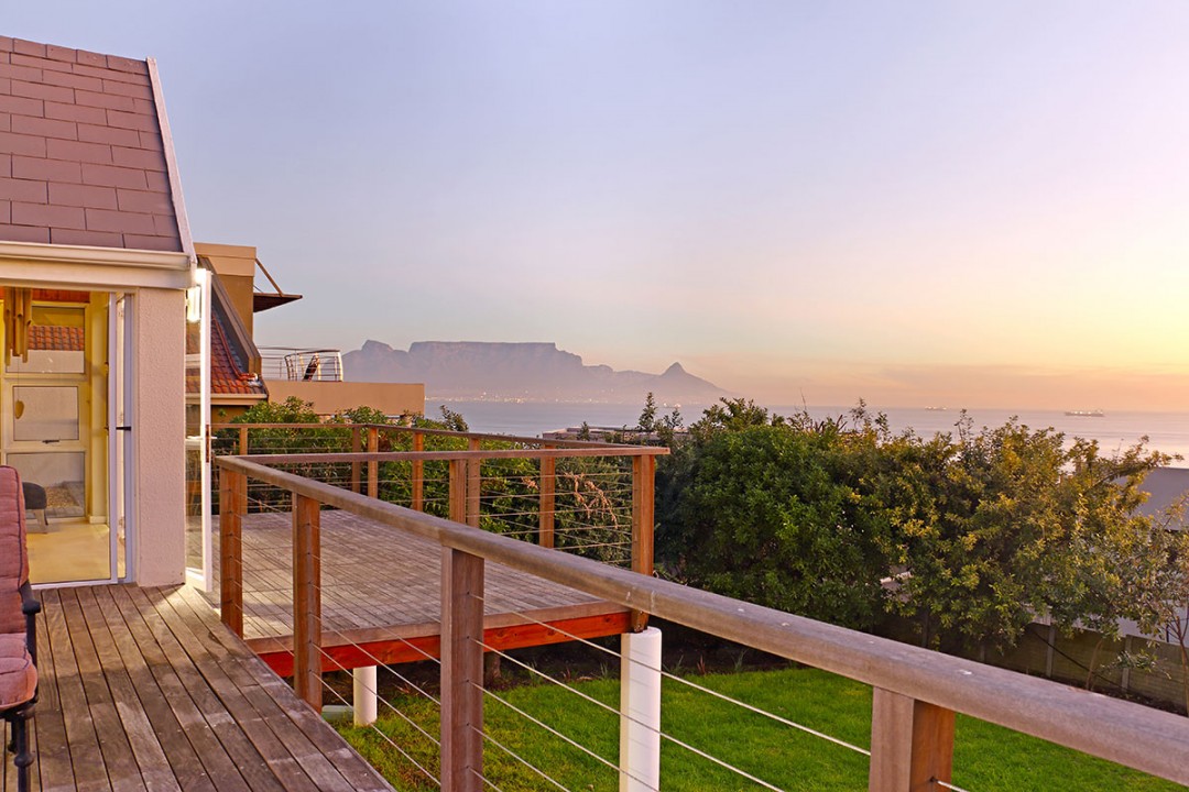 The lounge has 2 large couches and 2 single-seating chairs, arranged around a flat-screen TV with a DStv bouquet. The nearby dining area has seating for 8. This floor leads to an additional sitting area, which leads out to an extensive balcony with lounge furniture, a barbecue area as well as breathtaking views over the roofs of neighbouring houses towards the ocean.