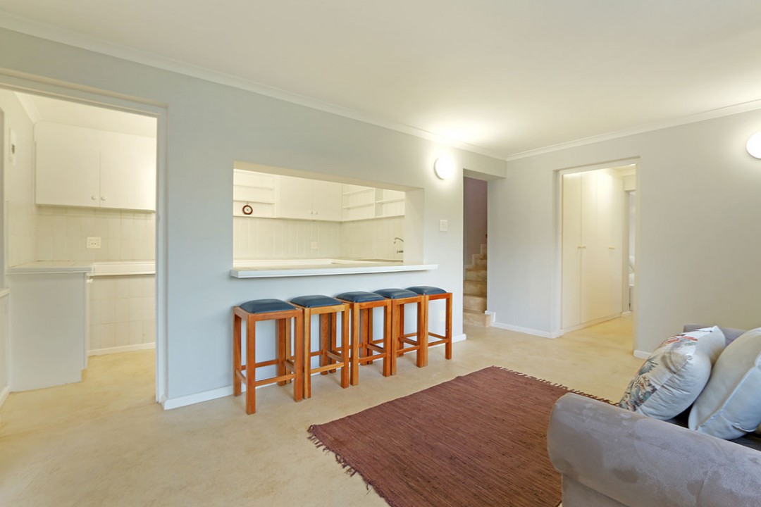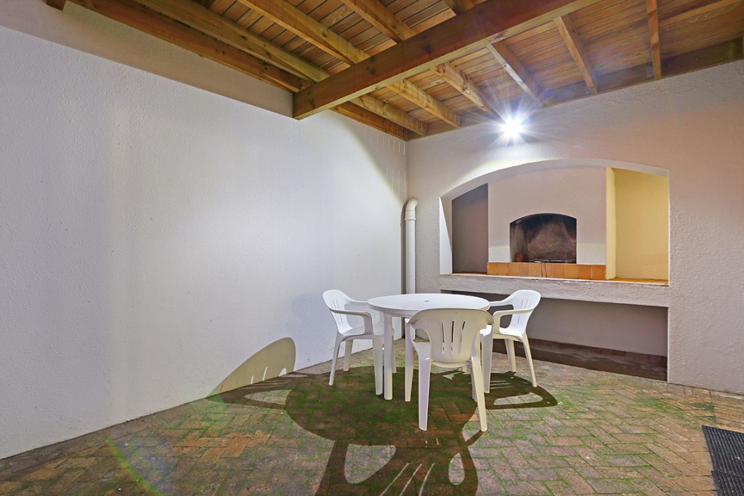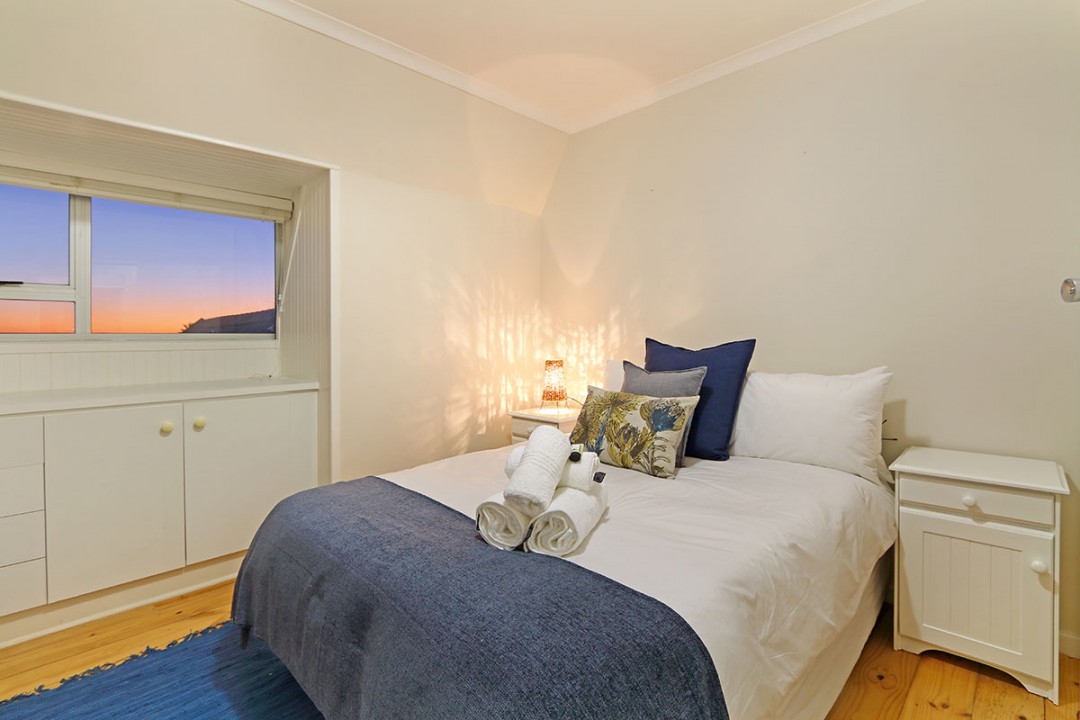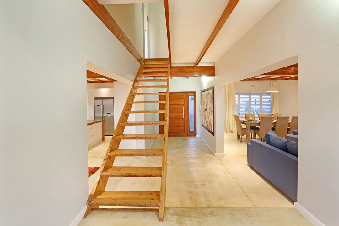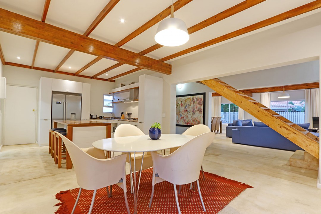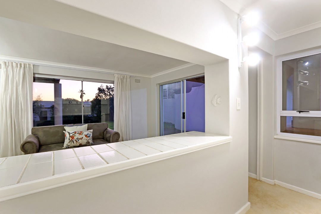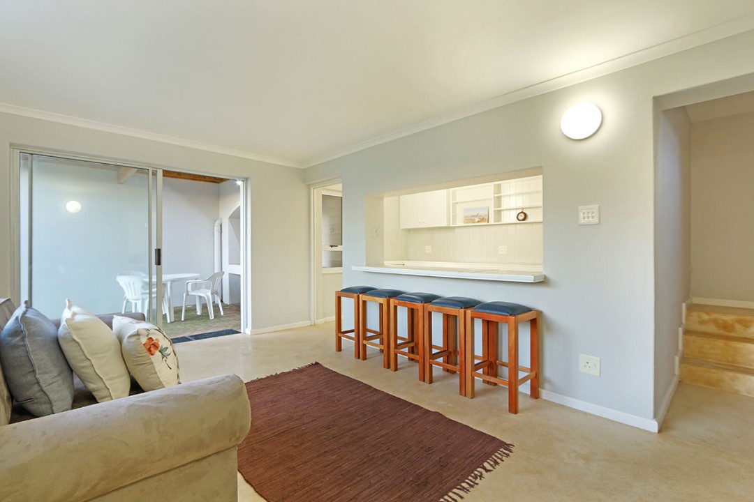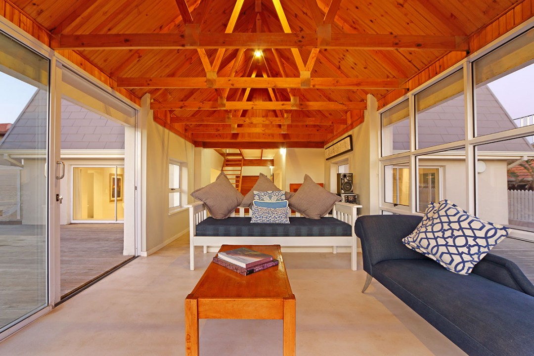 The lounge has 2 large couches and 2 single-seating chairs, arranged around a flat-screen TV with a DStv bouquet. The nearby dining area has seating for 8. This floor leads to an additional sitting area, which leads out to an extensive balcony with lounge furniture, a barbecue area as well as breathtaking views over the roofs of neighbouring houses towards the ocean.