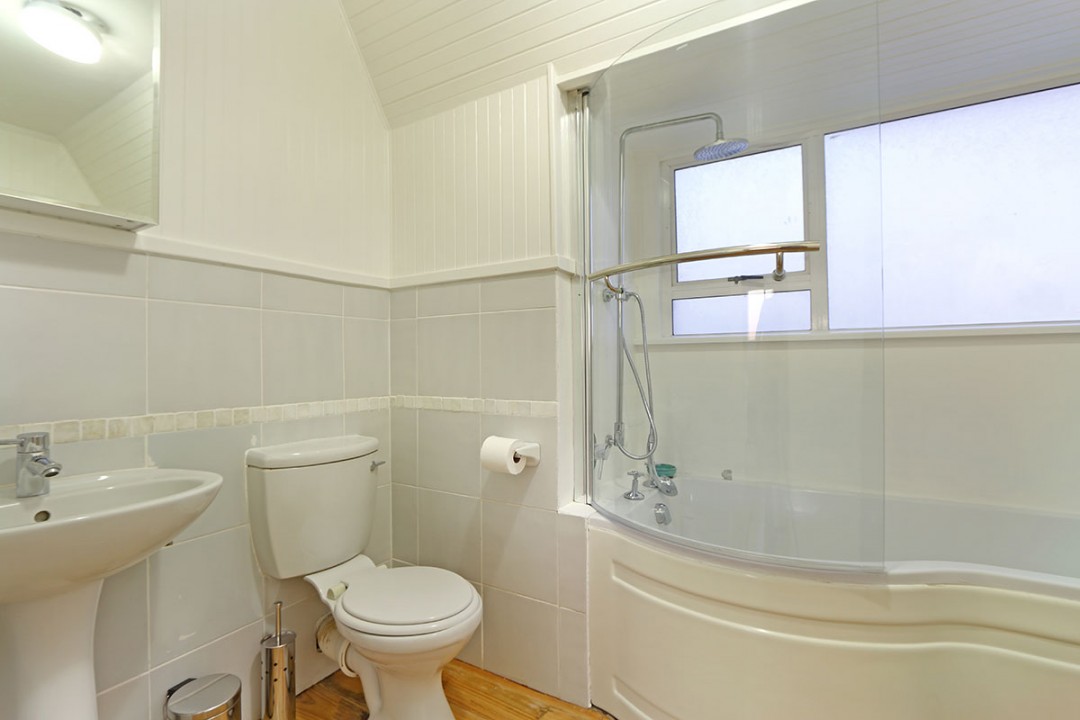 A stairway leads up from the main interior to 3 of the bedrooms. 2 bedrooms have double beds while the third has 2 single beds. 3 bathrooms are available here, 2 with baths and overhead showers and 1 with a shower only. From the main interior, another staircase leads down to a flatlet, which houses the 4th bedroom, as well as a lounge, kitchen area and bathroom with a shower. The flatlet leads out to a barbecue area with a dining area as well as a large garden.