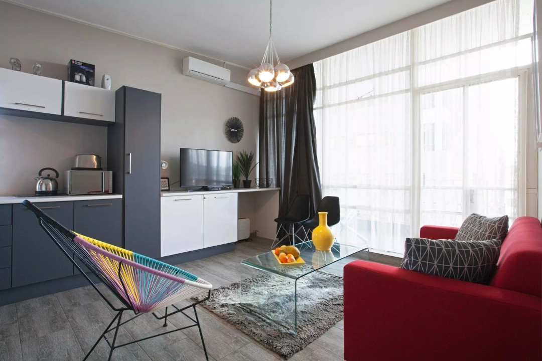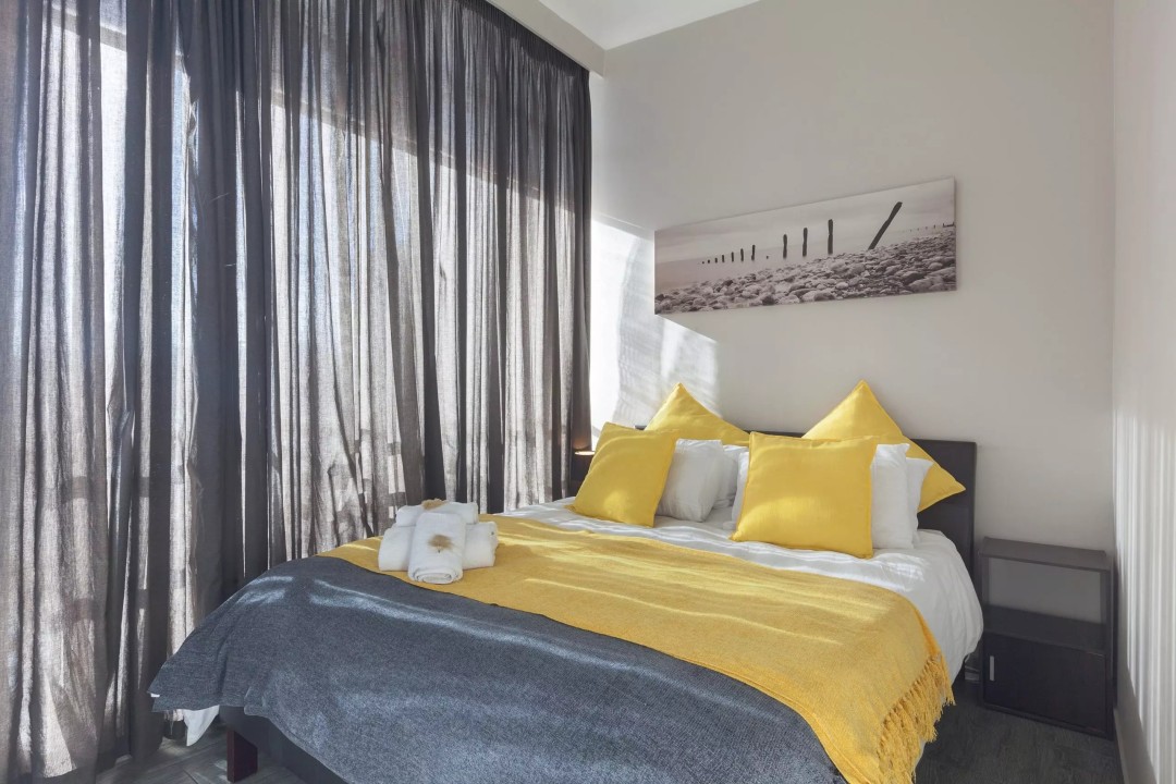 A welcoming city apartment feels when entering the modern open planned city double-bedroom apartment. Perfect for city lovers with an eye for the strange beauty the city offers. Both bedrooms can be entered right from entering the apartment. For those that would like less liveliness, the first bedroom that is situated on the right is a perfect choice. The bedroom is decorated in calming turquoise, grey, and white colors. The main bedroom is the best for experiencing the uniqueness of the city and is decorated with an interesting selection of yellow, grey and white colors which also have access to the balcony. This bedroom is especially perfect to spy out on city goers and lovers.