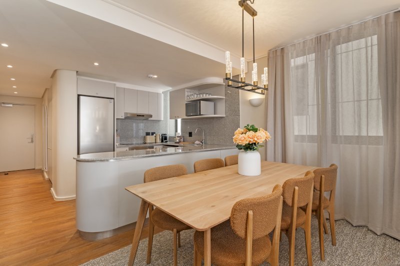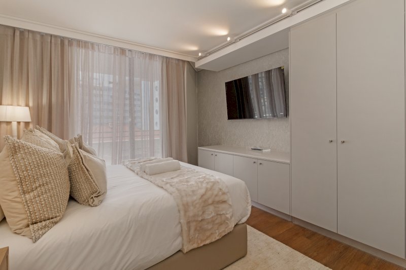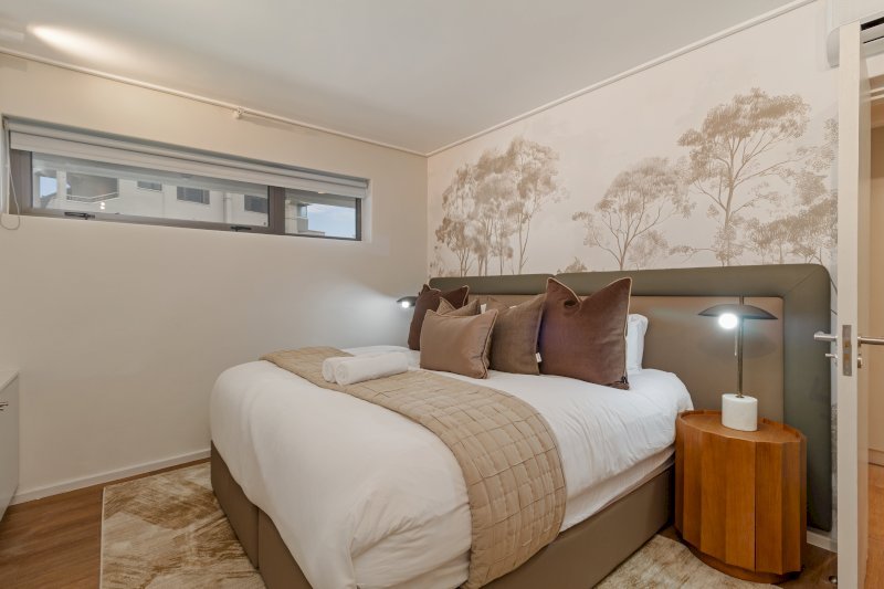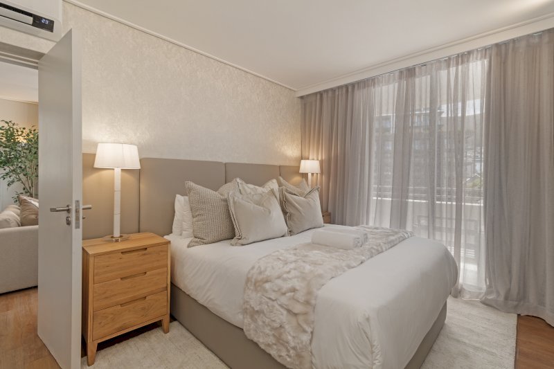This elegant apartment features a beautifully furnished open-plan living area with dining table, plush lounge seating, and seamless flow to large windows framing Sea Point’s urban and mountain surrounds. The fully equipped kitchen has everything needed for extended stays and family meals. Bedrooms are spacious with hotel-quality bedding and storage, while modern bathrooms provide a luxurious finish. Perfect for longer stays, remote work, and relaxed coastal living.
