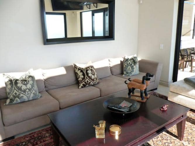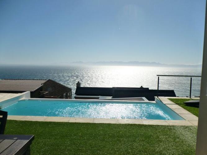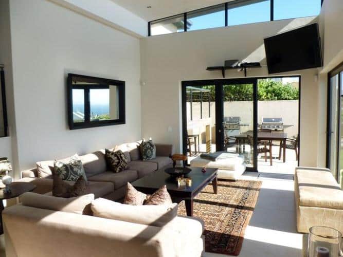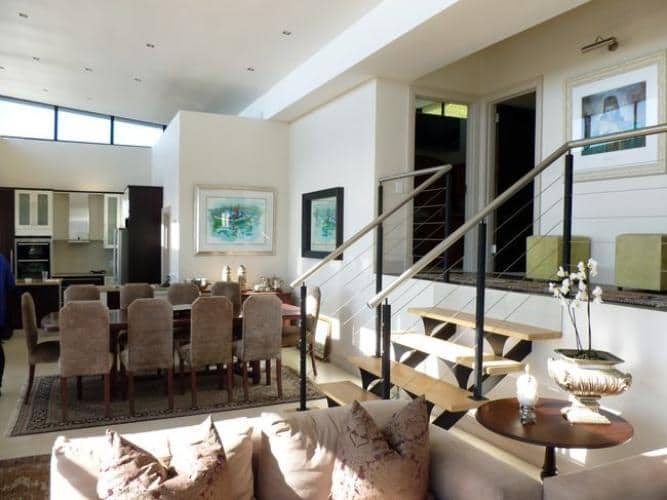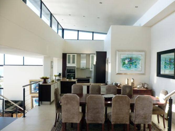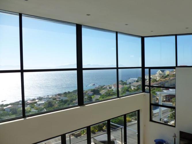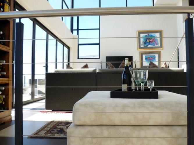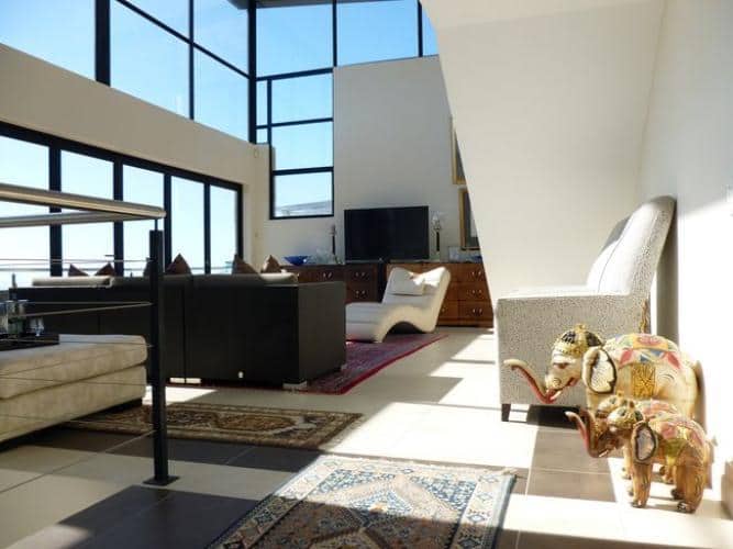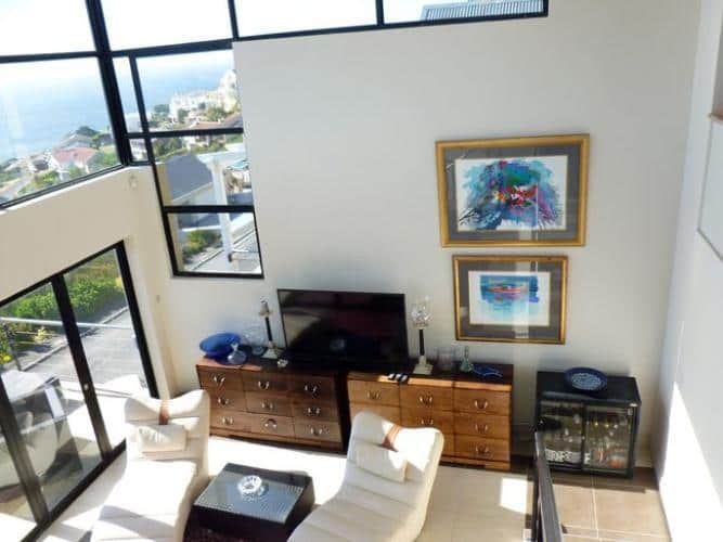 Walking in you get this feeling of space with a triple volume. The lounge with modern furniture overlooking the False Bay through “seamless” glass makes your feel you can touch the ocean. The up a set of stairs to the next landing.