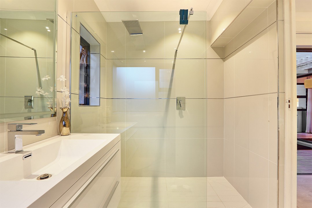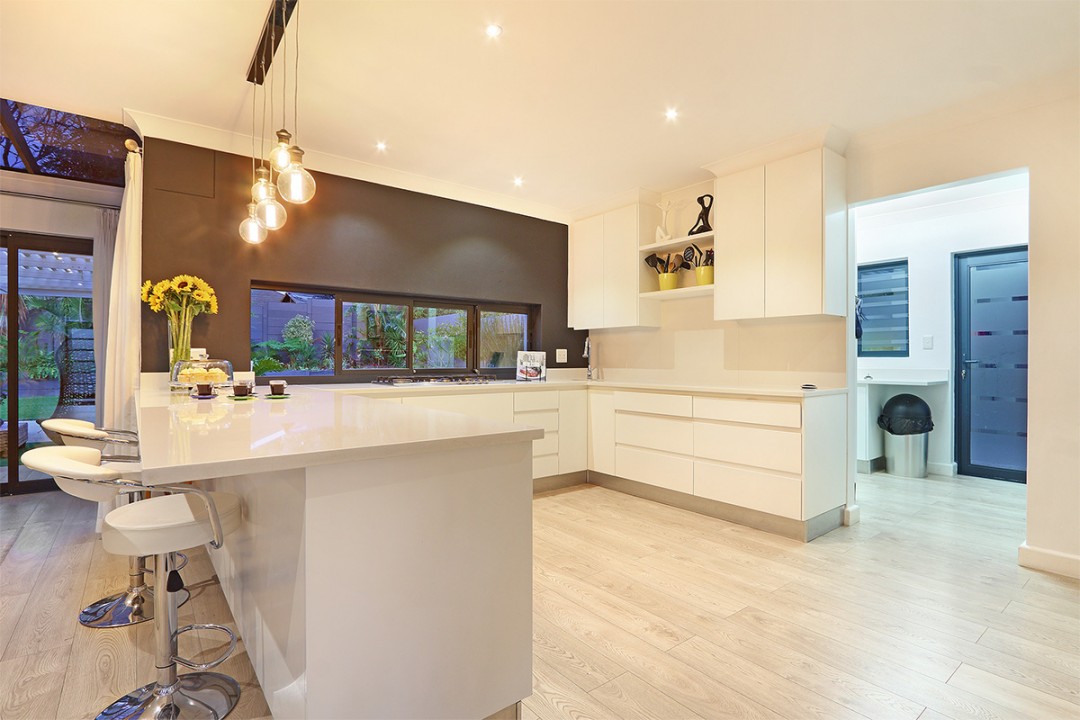 The open-plan kitchen with private scullery is part of the entertainment area with an easy flow to the dining room and outside pool deck. Good size garden completely fenced with ample parking.