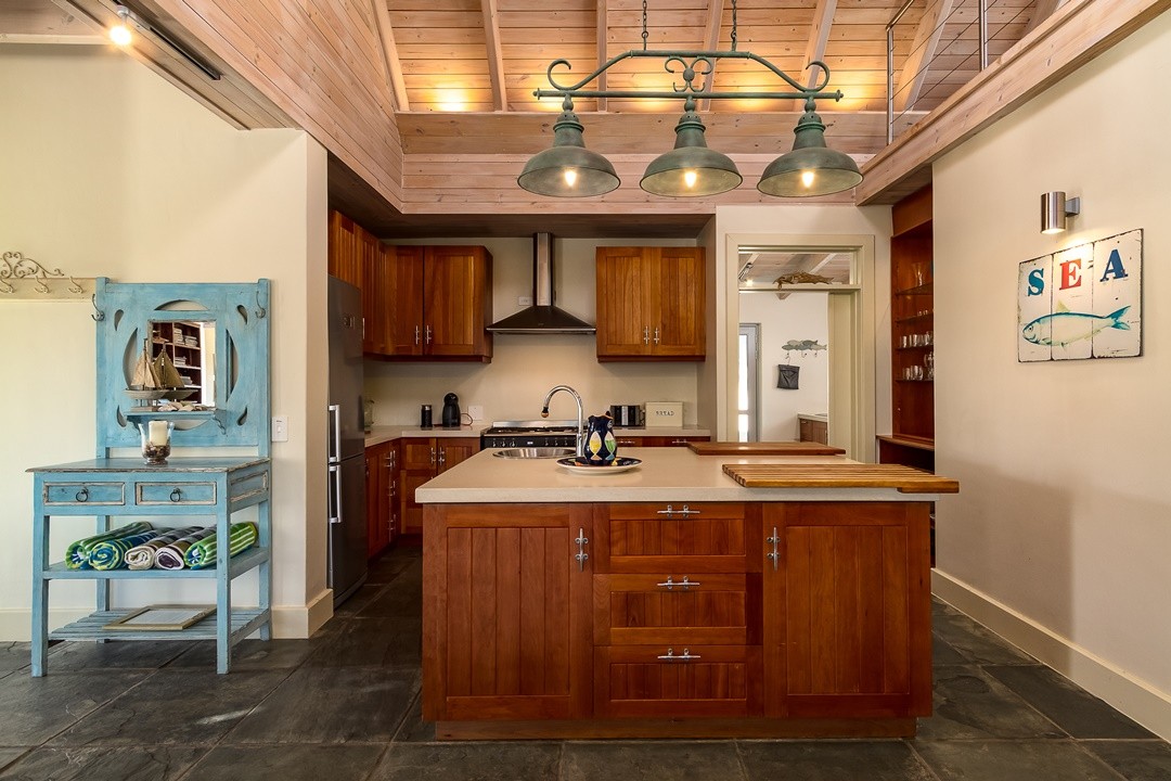 Lovely relaxed beach style interior with open plan tiled living area, dining area and fully equipped kitchen.