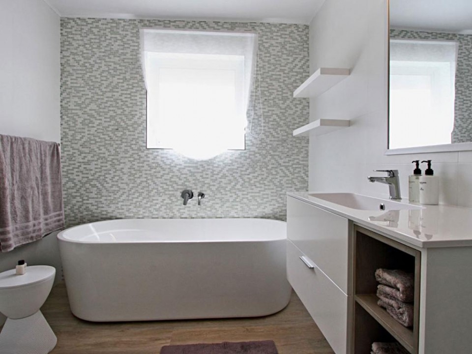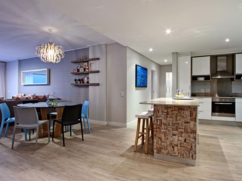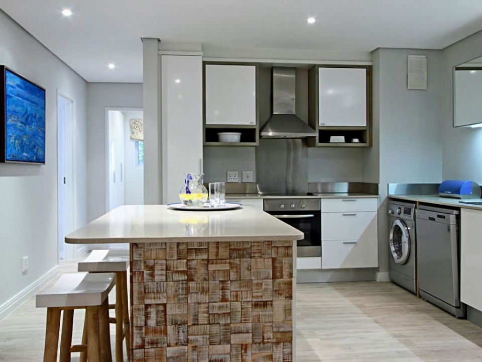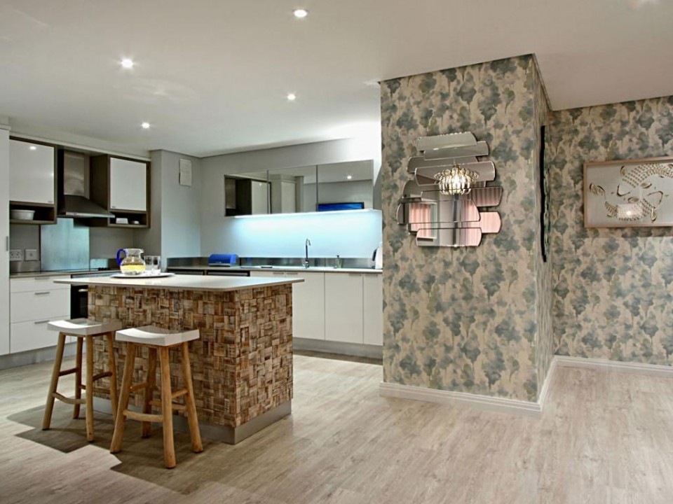 The apartment is air-conditioned and includes DSTV and Netflix for entertainment. The sleek kitchen is fully equipped with a double fridge/freezer, built-in oven and hob, dishwasher, washing machine, and a breakfast bar with two stools — perfect for casual meals or morning coffee.