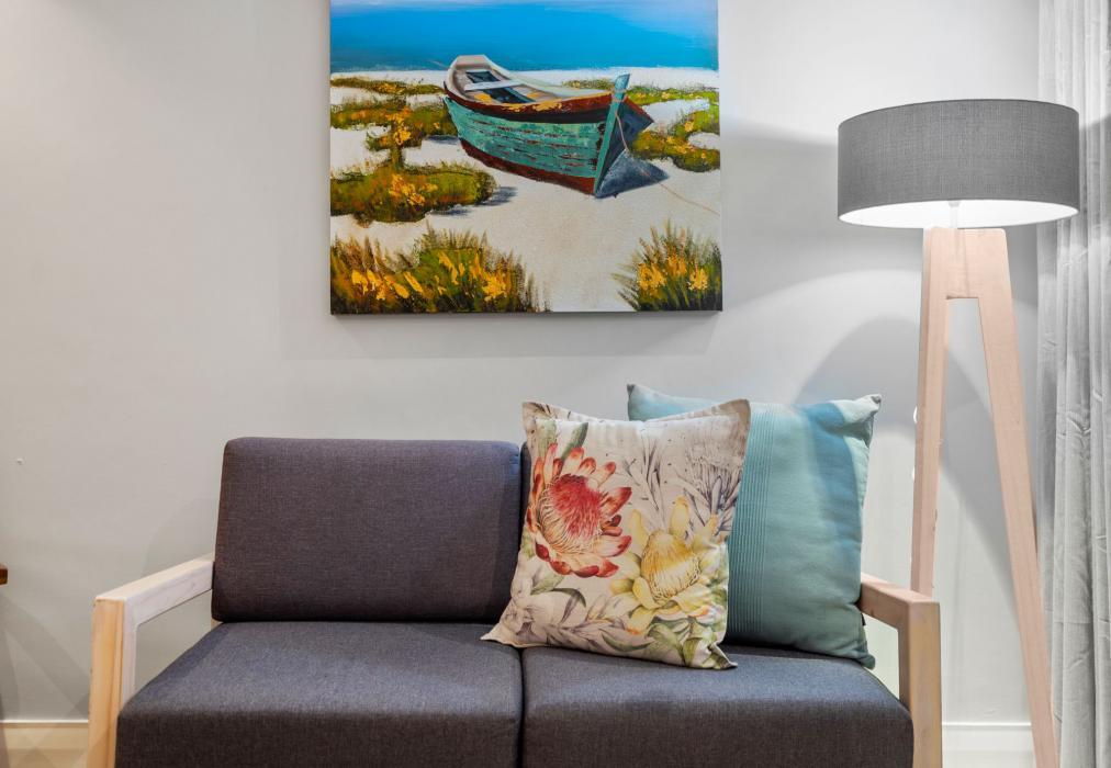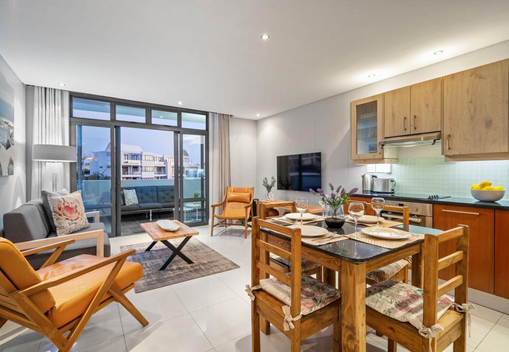 This tastefully furnished apartment is ideal for a self-catering stay, featuring an open-plan layout that maximises space and light. Guests are welcomed into a bright living area with comfortable seating, a Smart TV with DSTV and Netflix, and direct access to a balcony with outdoor furniture—perfect for morning coffees or evening sundowners while enjoying the ocean and mountain views.
