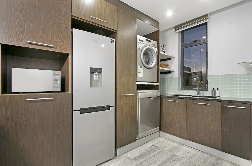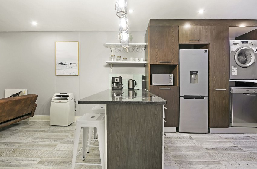 The apartment has an open plan kitchen and lounge complete with a rustic wood-like tile, a leather couch and stylish touches in soothing neutral shades. The kitchen is fully equipped for self-catering and includes a dishwasher, a washing machine and island seating for 4. The lounge features two sofas, WiFi, and an impressive flat-screen TV for relaxing nights bingeing your favourite series. A standout feature of this home is the balcony that boasts a gas braai/BBQ and a picnic bench – perfect for alfresco dining in good company.