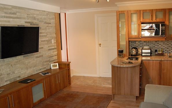 The lounge has air-conditioning (that is available on request at a daily electrical surcharge cost). There are sliding doors from the lounge that flow out to the garden with undercover barbecue area. There is a dining room leading into the divine granite kitchen, which is fully equipped with fridge/freezer, dishwasher, microwave and glass top stove and oven. Secure undercover parking is steps away. – This is a self-catering option, however if requested breakfast can also be arranged at the guest house for and additional charge, and service of house for reasonable rates.