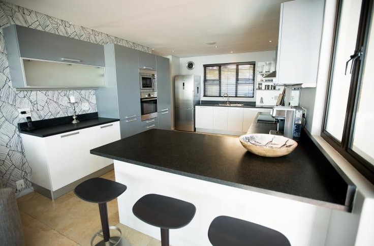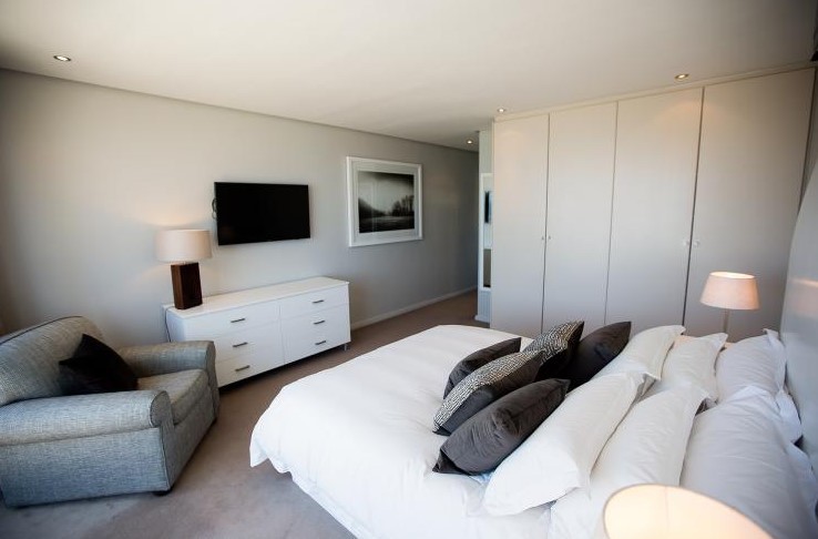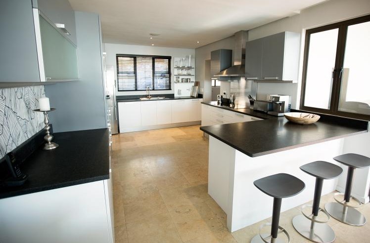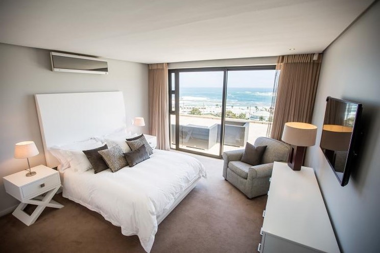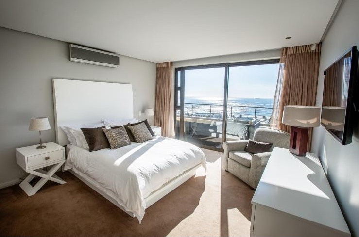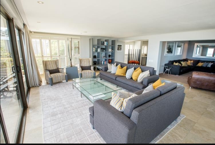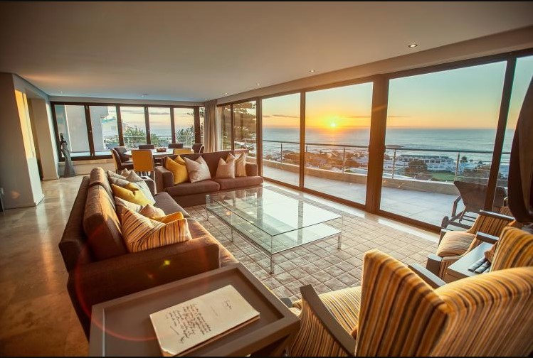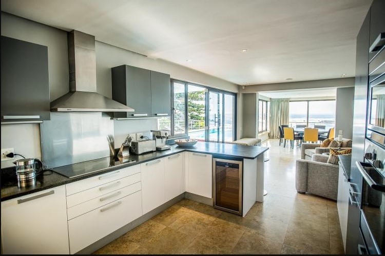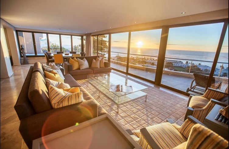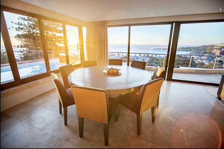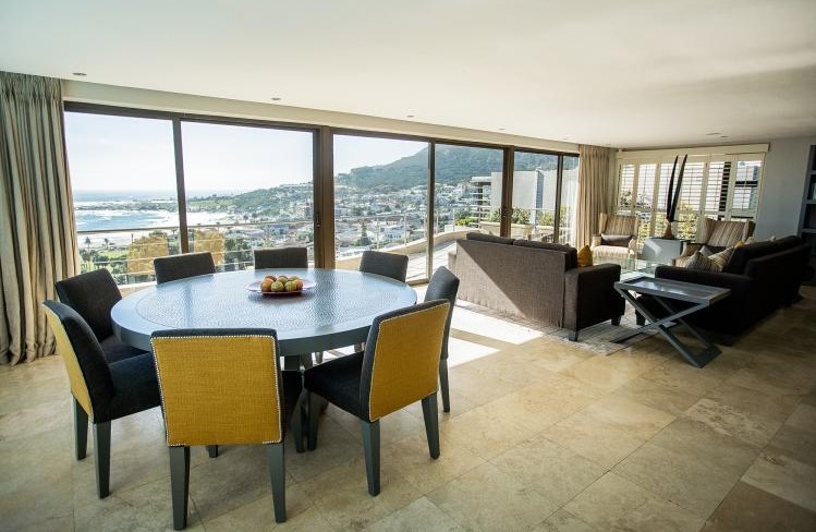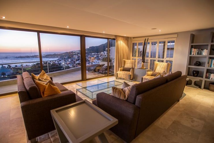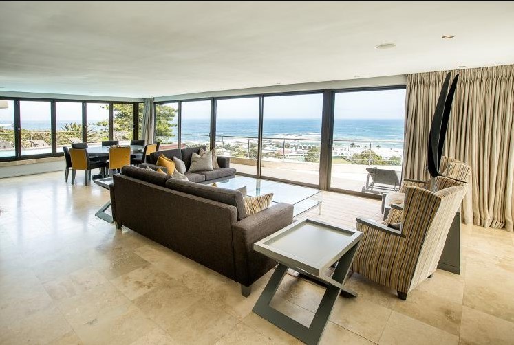 The entire length and side of this coastal villa is glass-fronted, with spectacular views of Camps Bay, Lion’s Head and the Twelve Apostles mountains behind, from the living area and rim-flow pool. The lower level of the villa is the main entertaining area and is partially open-plan with the living and dining areas making full use of the views at the front of the house.