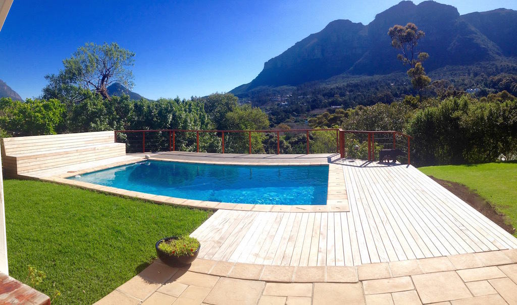 This compact American style wood home is perfect for entertaining and/or young families. Gorgeous views over the Hout Bay mountains offer peace and respite, whilst the large lawn area has a jungle gym and trampoline for kids. A large pool and deck area are ideal for the hot summer sun!
