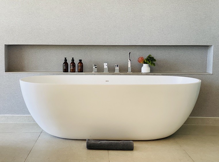 views, high ceilings, standalone bathtub and walk-in shower with ocean view.
