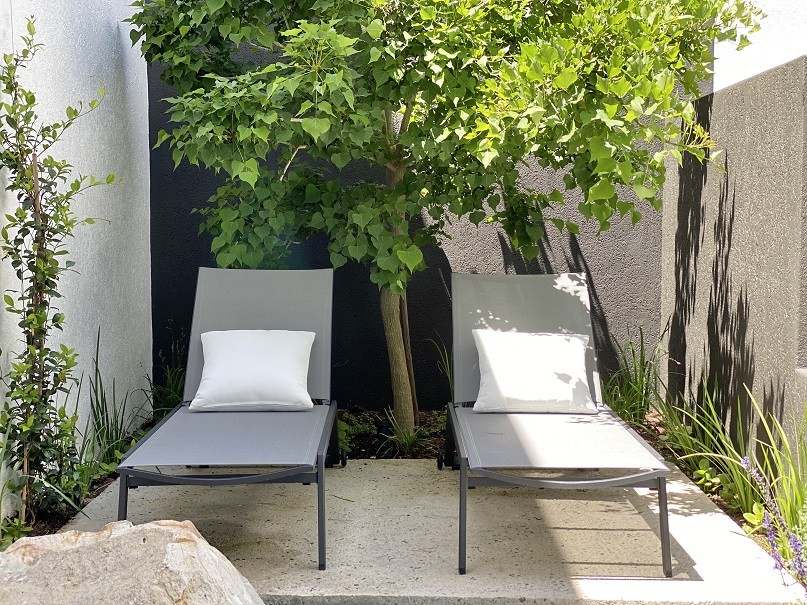o Northeast courtyard garden with loungers and water feature