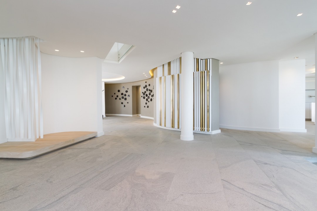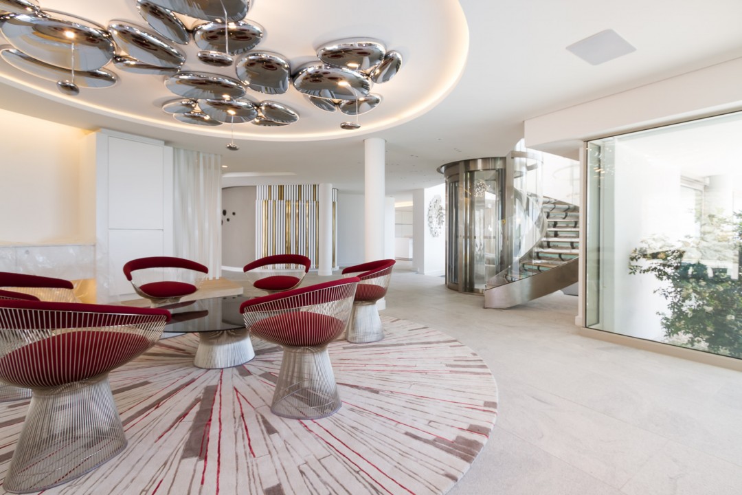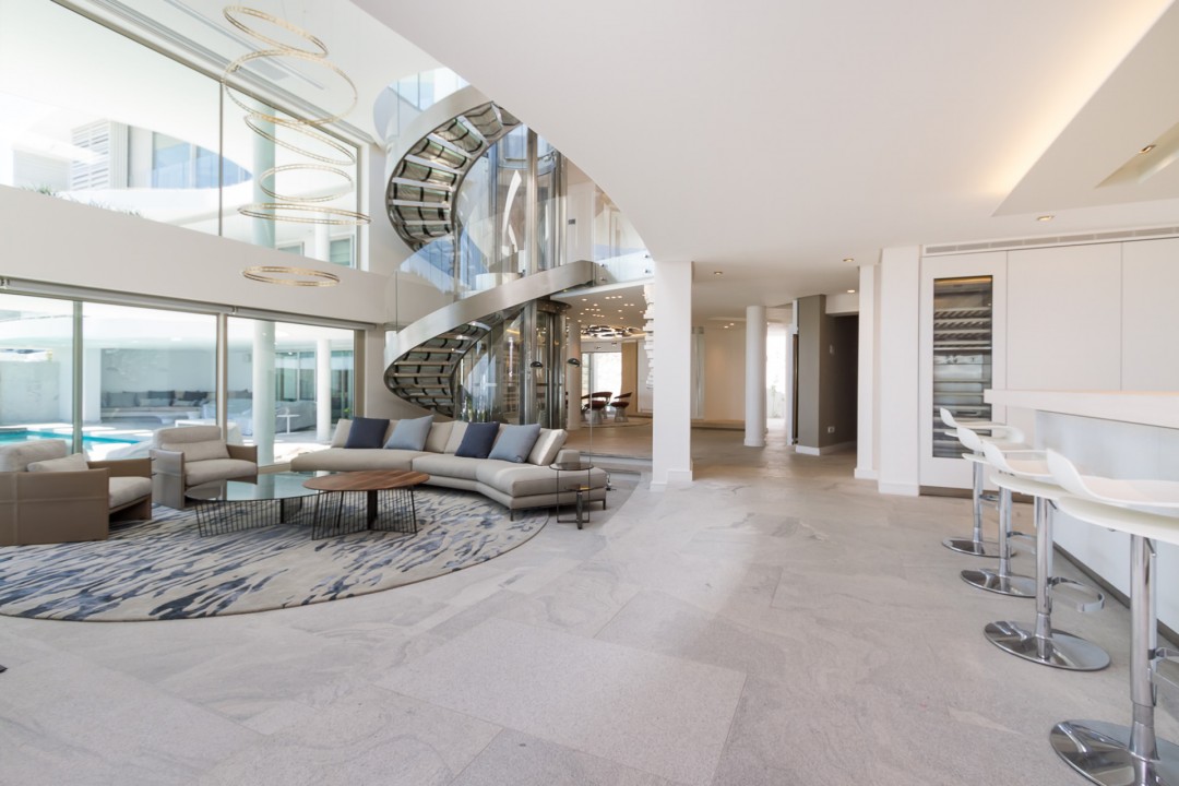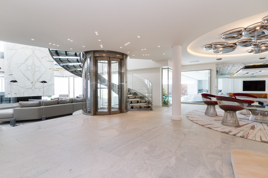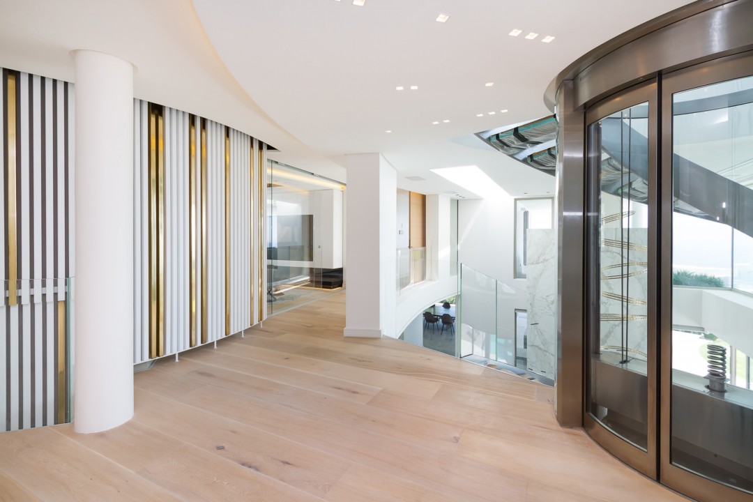 A dramatic glass floating, curved staircase, reveals a capacious interior space.