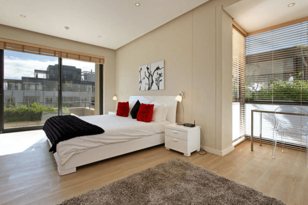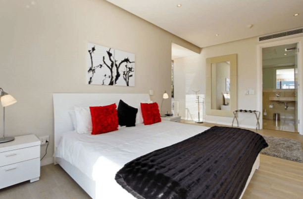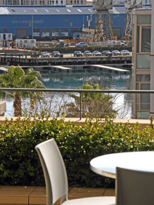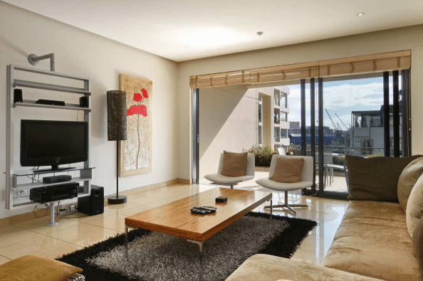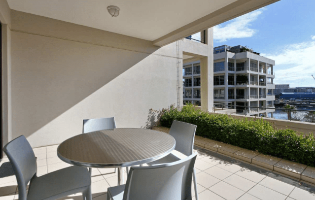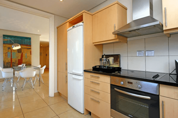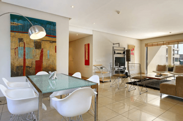With its light and airy feel and open space it will suit many a visitor. The apartment has a well equipped and convenient kitchen. A large balcony provides wonderful views of the Marina and its canals with the Waterfront and Green Point Stadium beyond.