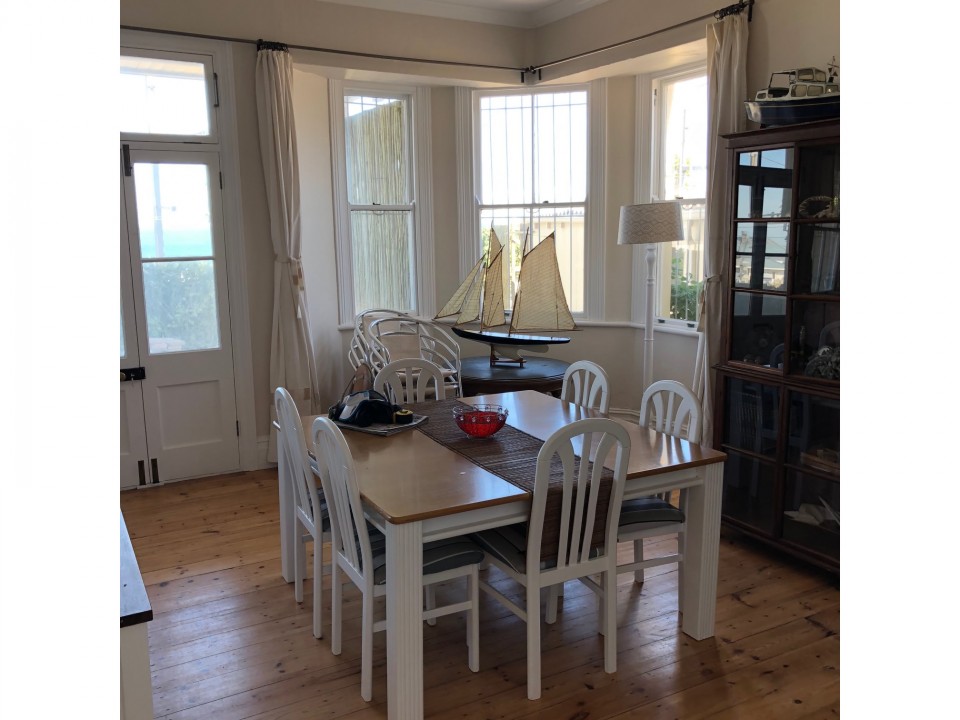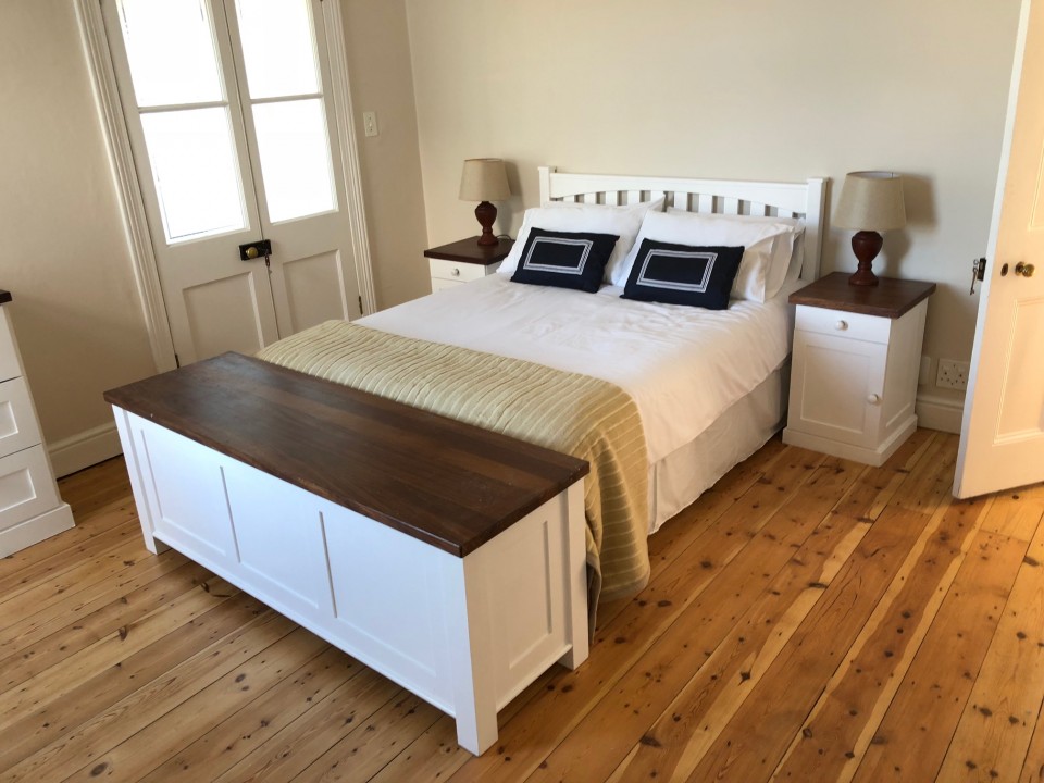 Ground floor comprises of entrance hall, guest wc, living/dining room, open plan fully equipped kitchen/breakfast area, opening onto a timber deck and outside BBQ area and an enclosed garden overlooking False Bay.The deck has a large table and 8 chairs – sit and enjoy the view over False Bay.